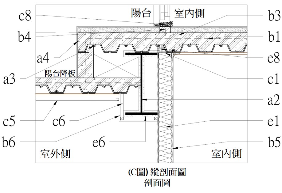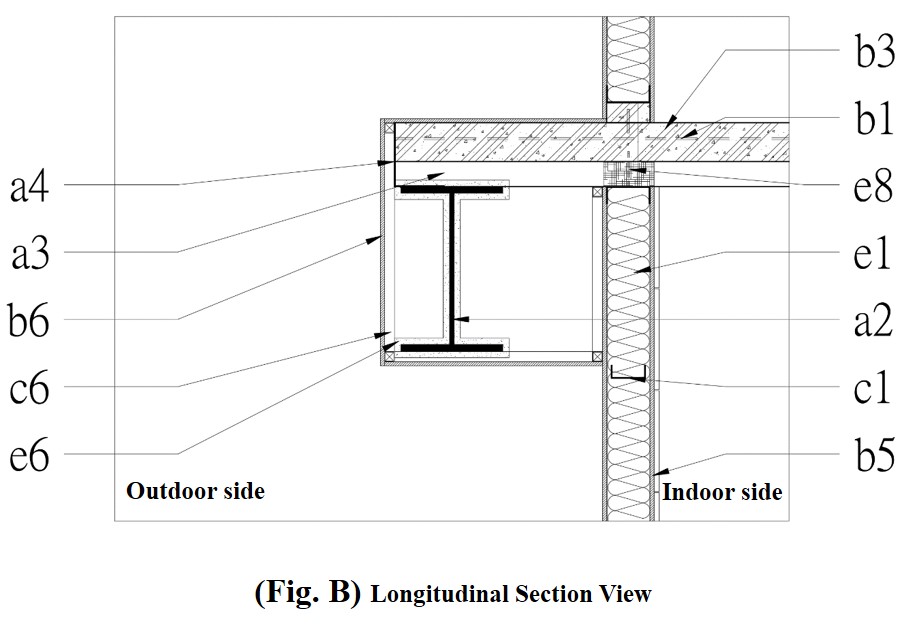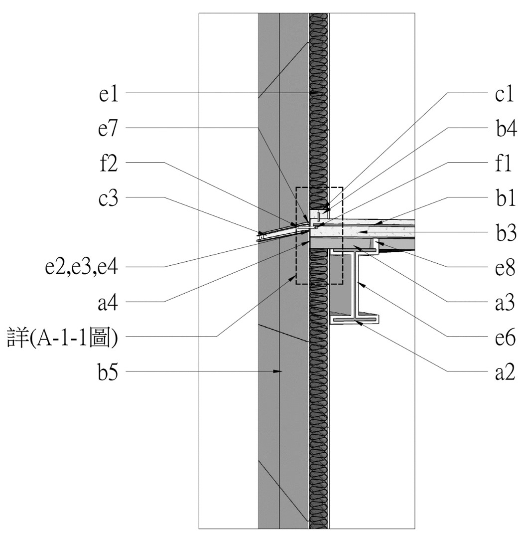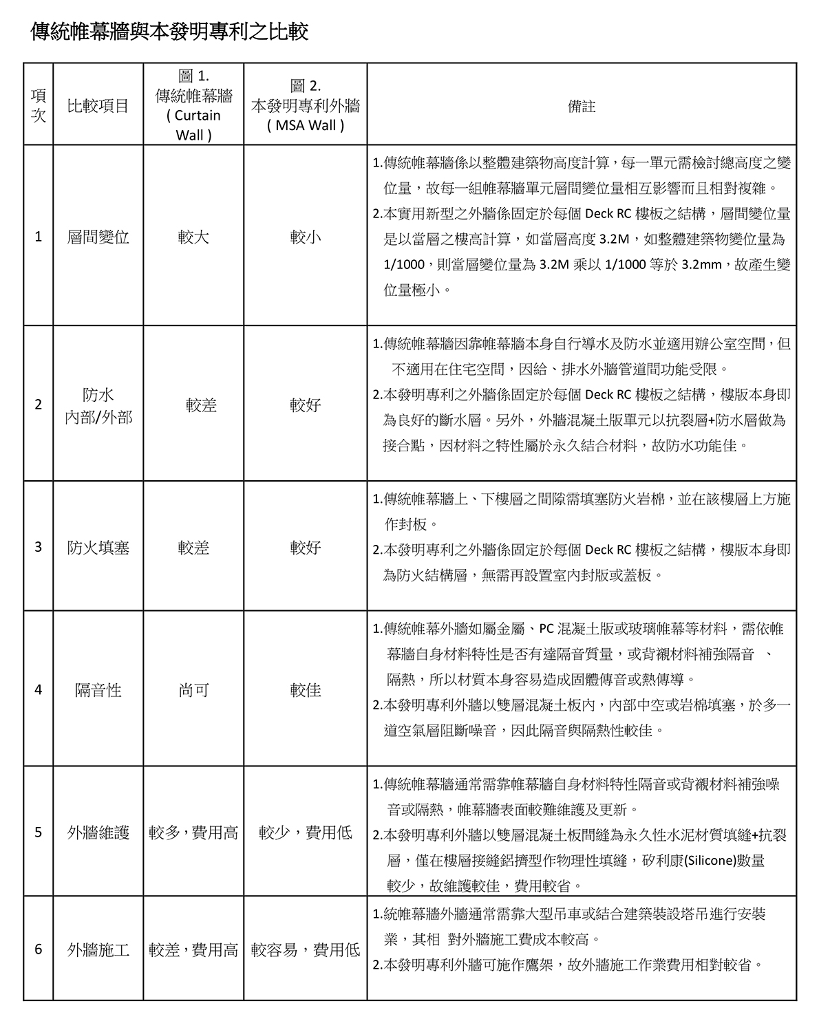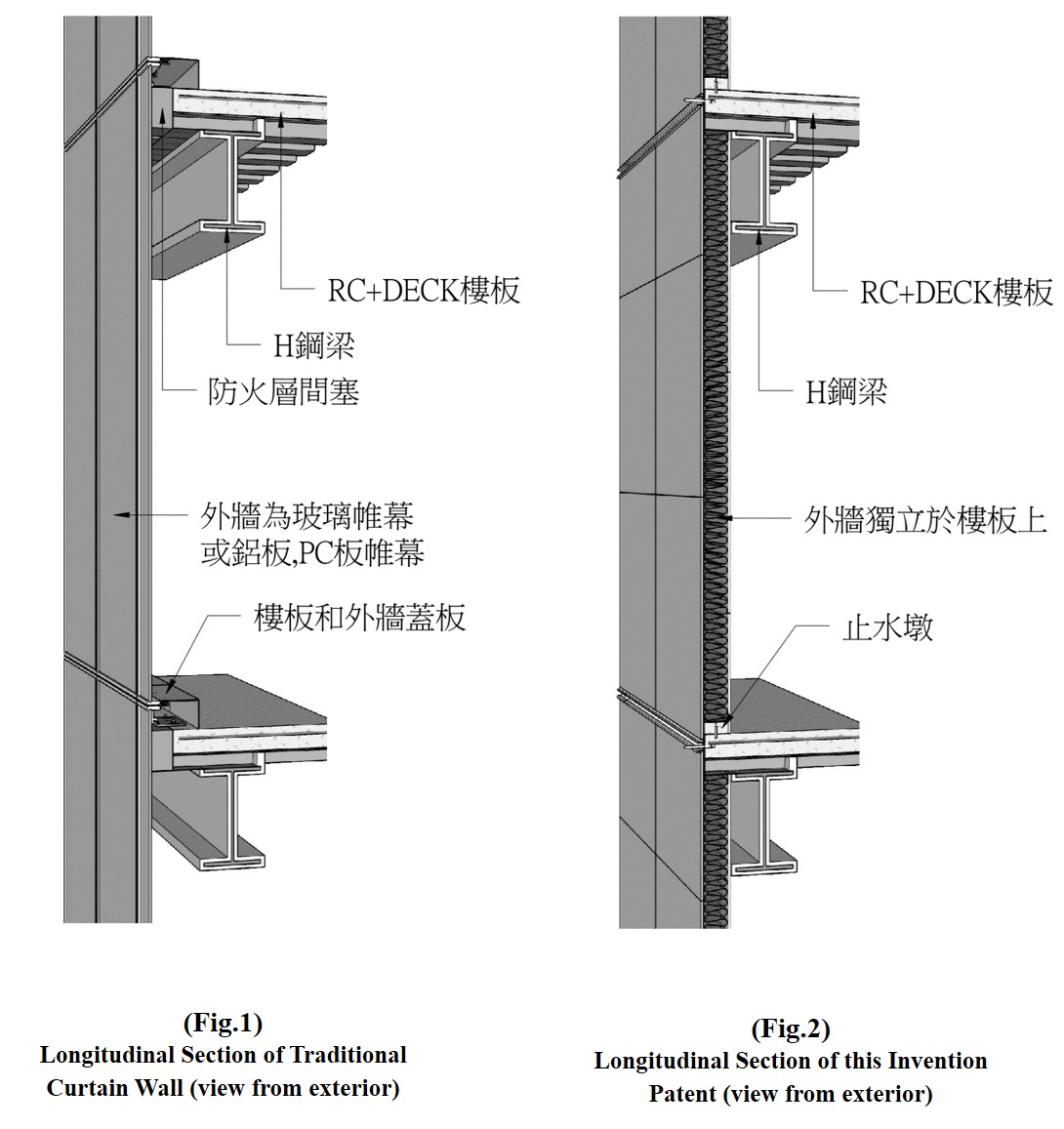 本發明專利利用各層樓板作為外牆的固定基礎,使得外牆為獨立系統(如圖2),樓層分段分層有利處理防火、防水、防火、隔間..等性能要求。因此本發明專利提供了解決外殼各部位結合與施工方案,包含DECK鋼承板與外牆、外牆與陽台結合,以及外部施工鷹架的安裝、固定、與拆除步驟。