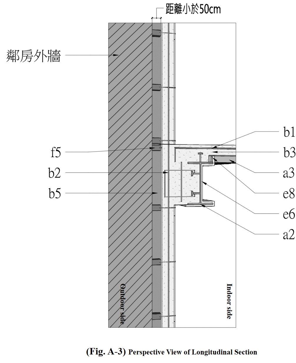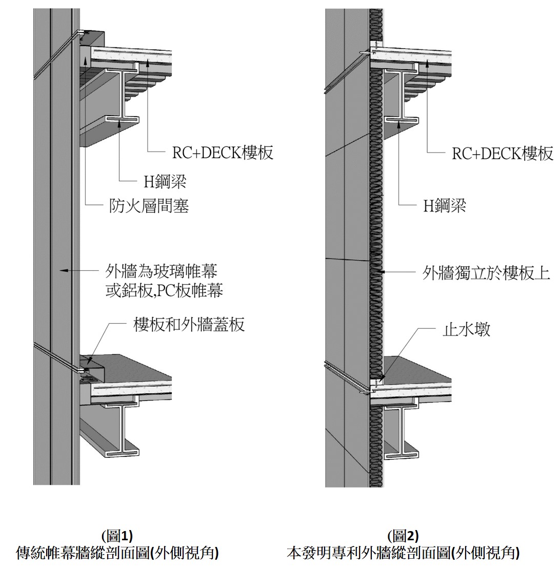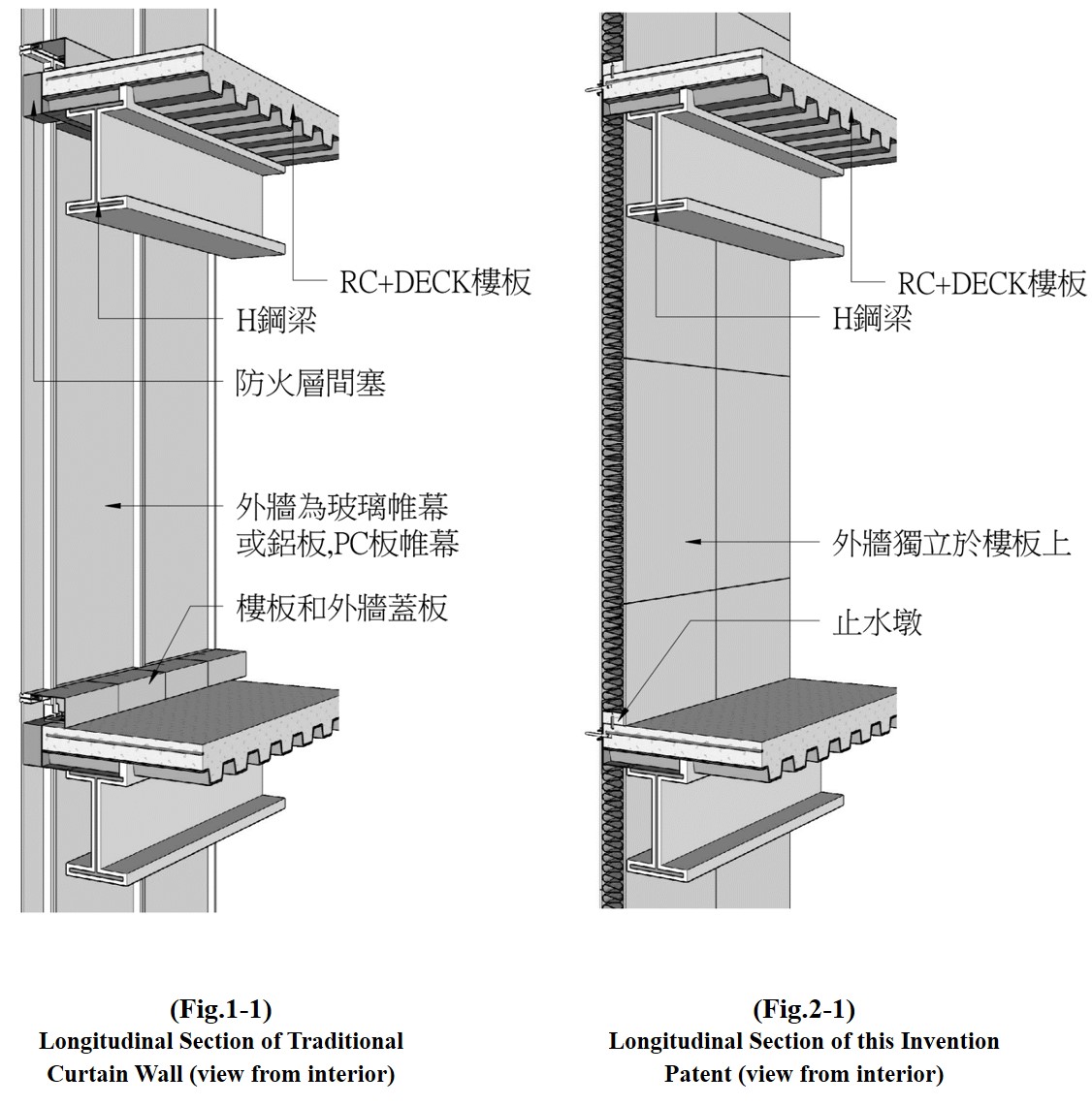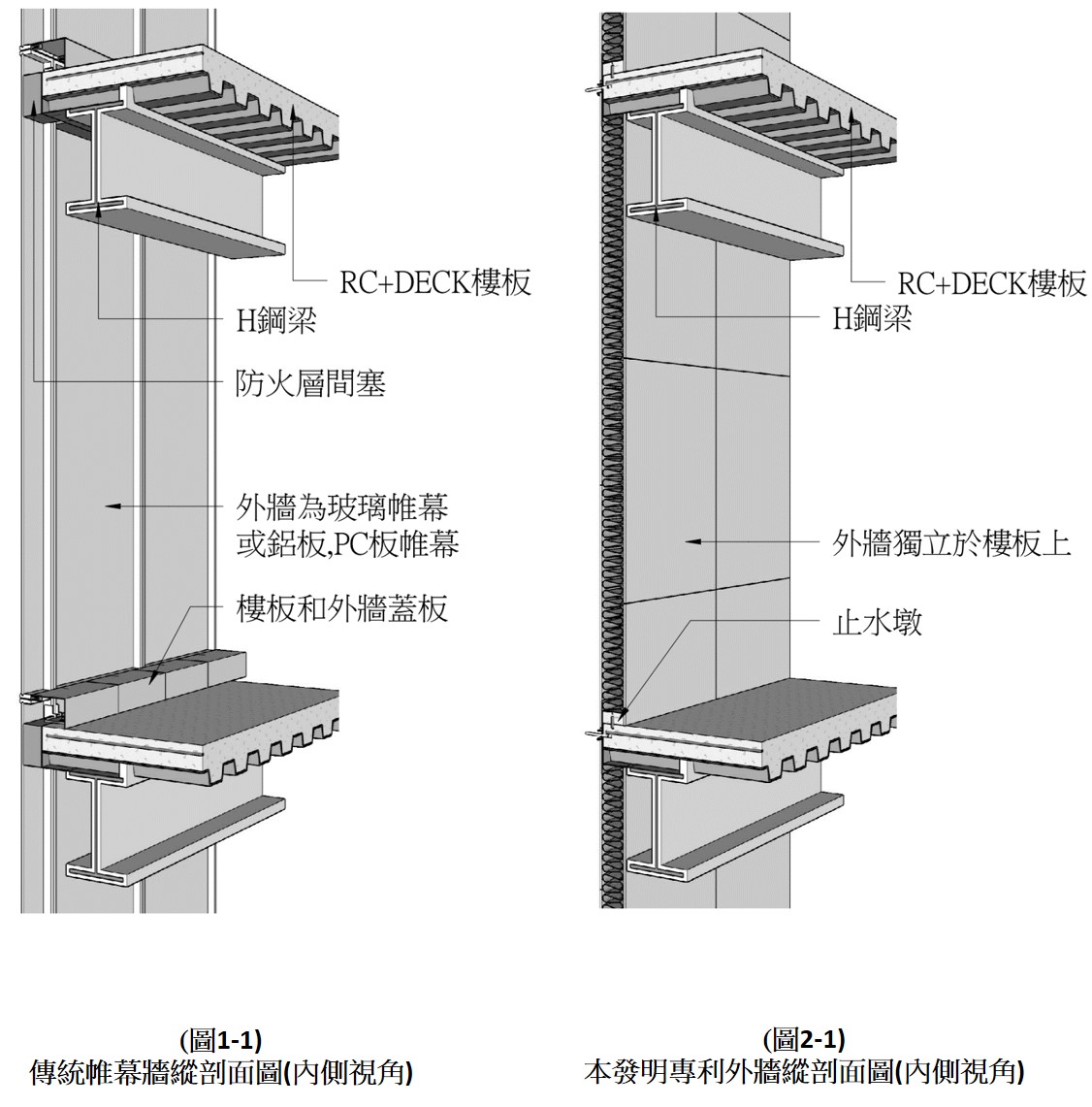 鋼構造外牆一般採帷幕牆系統(如圖1),組合方式是將外牆吊掛在構件上,再固定於鋼樑,位於樓板上下之間的縫隙以隔板包覆加防火填塞作為防火區劃,由於帷幕牆自重輕,模組化單元,施工組裝快。因為單元化的構件,使得每處的接合點可調整梁柱結構和帷幕構件的施工誤差,也容易吸收層間變位,但先天的缺點式樓層接合氣密性不佳,容易造成樓層之間使用上的相互影響。