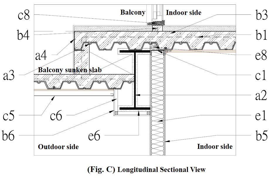 - (a1) Box-type steel column + (a2) H-shape steel beam/ Assemble for each floor, including balcony sunken slab’s cantilever beam.