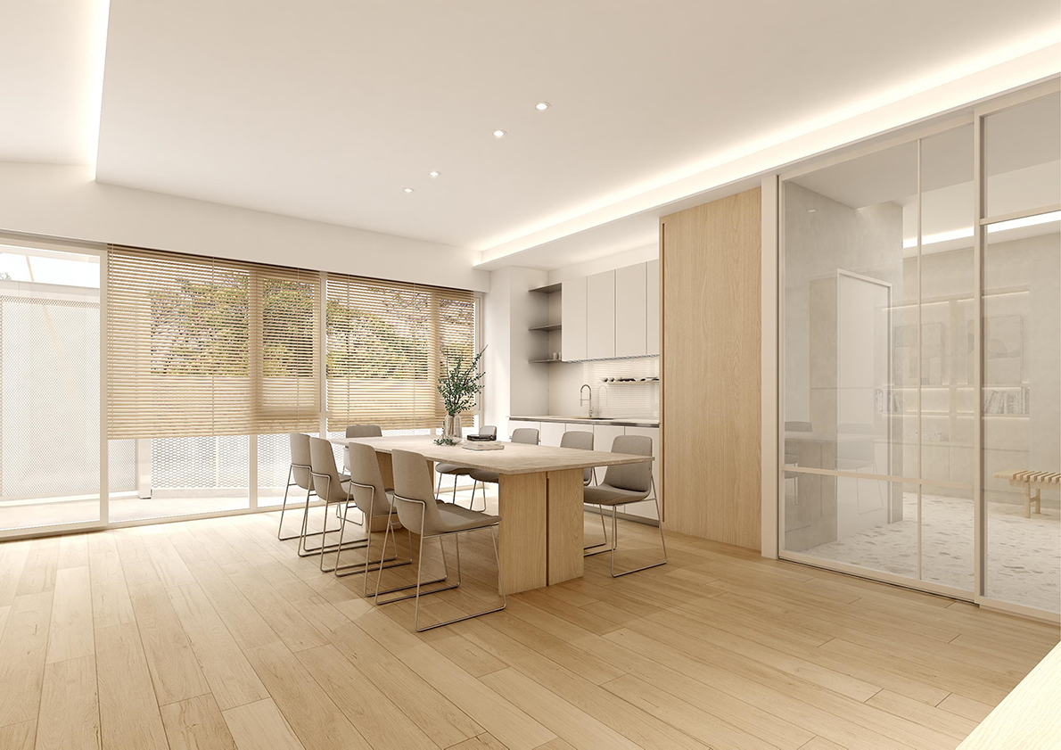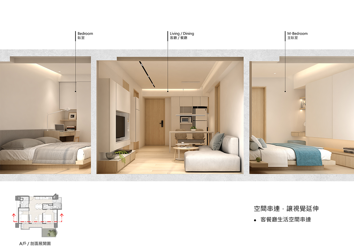 「切割空間屬性」但不封閉空間界線,例如;links of LDKS(客廳living、餐廳dining、廚房kitchen、書房study)串連。「切割立面」,但不劃分屬性,例如:充滿機能性的牆嵌入牆面,房門呼應著牆面的延伸,達到視覺尺度放大的效果,如櫃子般的門(隱藏門)、純粹的白牆、溫潤的白橡地板、虛實俐落、超強收納、流暢的動線與內外交融的空間,讓室內延伸至戶外(陽台),不界定內外空間,突破小空間「狹窄」的刻板印象。