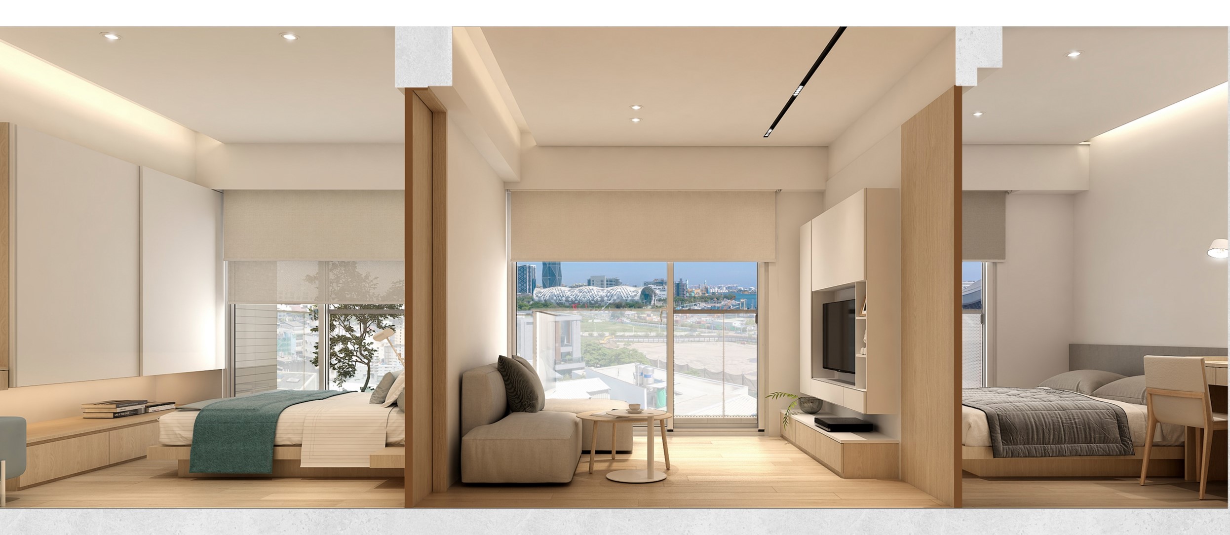純白色的量體透過陽台凹凸塑型,木質調的加入活潑了建築的表情,植栽的綠意從景觀陽台的間隙飄出,光影、綠意書寫在純白的量體上,巧妙分割立面,層次分明、自然節奏、與環境和諧…就是要讓每個人「想住」!
