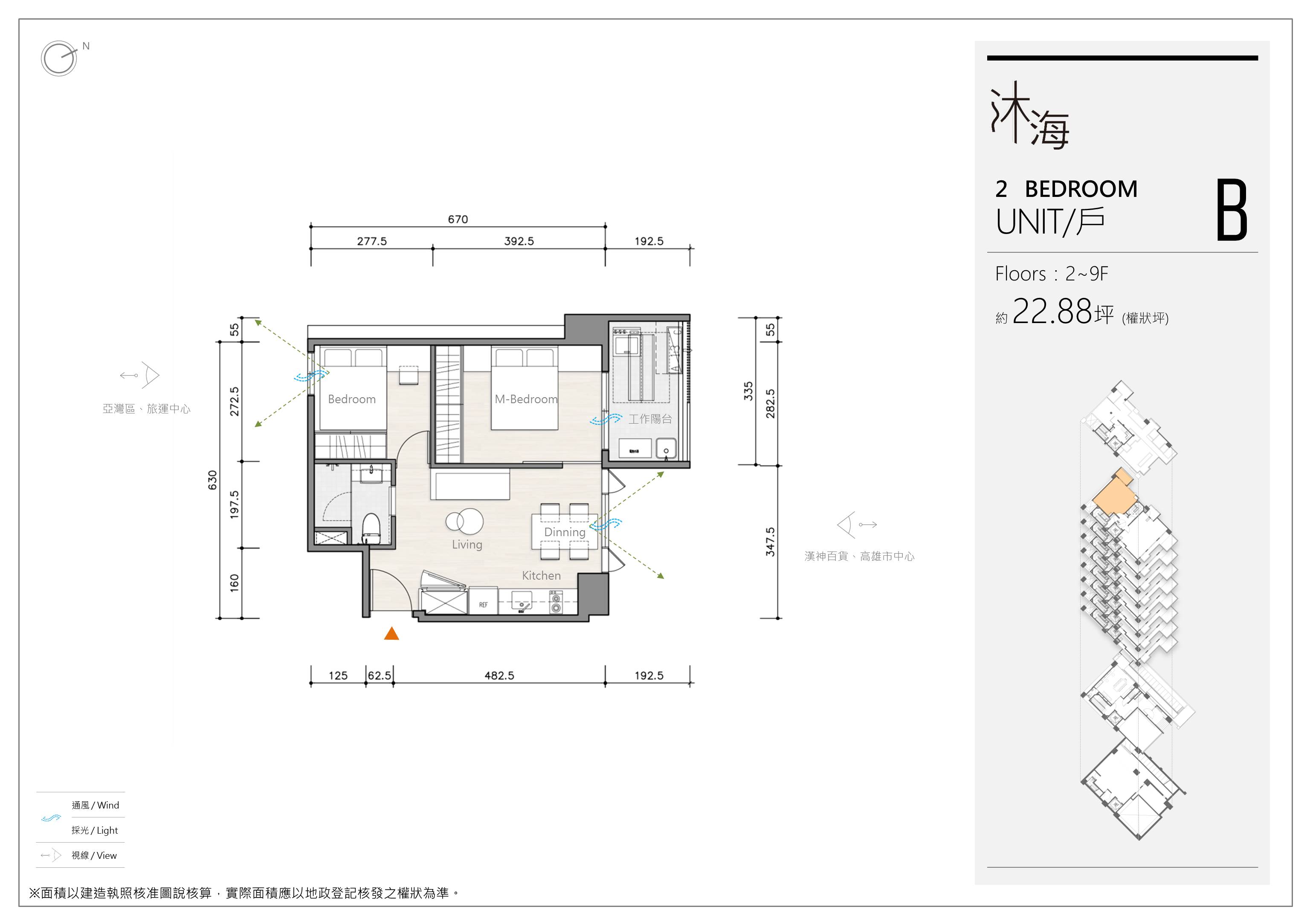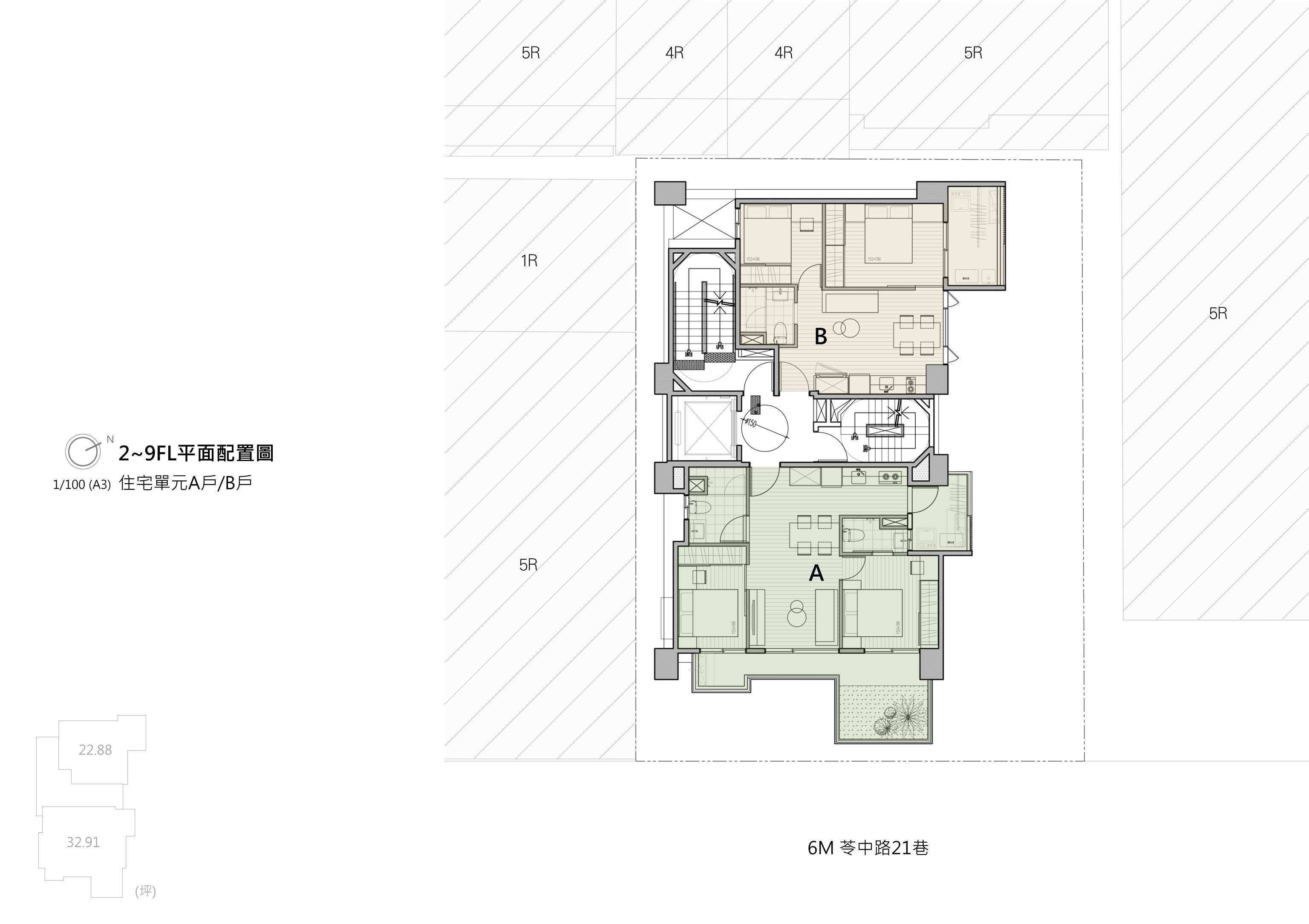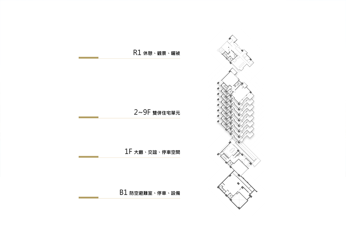 建築規模 / 地上9層,地下1層,樓高3.2m,雙併,共16戶。規劃5個機械車位,16個機車車位。各戶權狀坪約 :A戶(2-8F)-32.91坪、A戶(9F)-32.28坪、B戶-22.88坪。(註:有關銷售面積、外觀、平面配置..等,僅供參考,實際以銷售合約為主。)