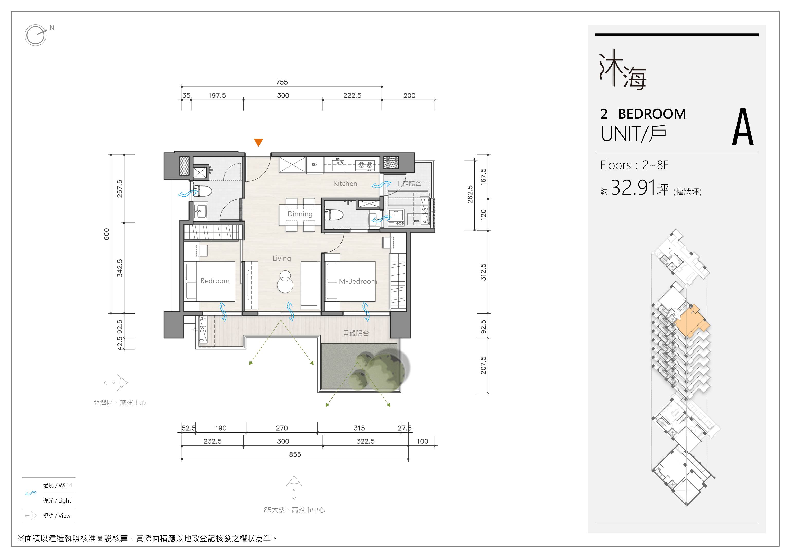 明森建築將本案取名「沐海」,以層次分明的白色建築和諧於藍天、融沐於海灣,白色為畫布, 陽光陰影自然地展現建築的樣貌。