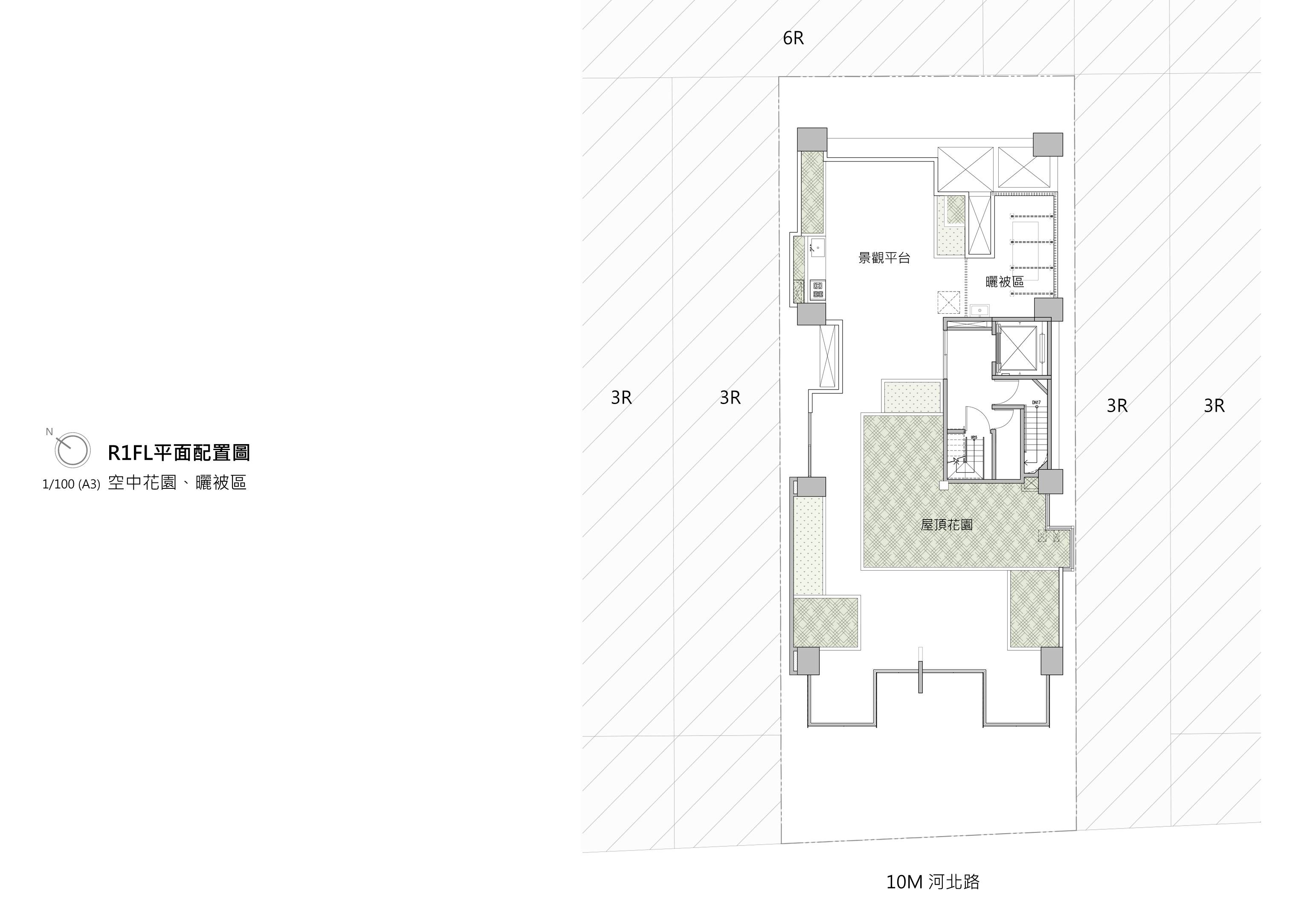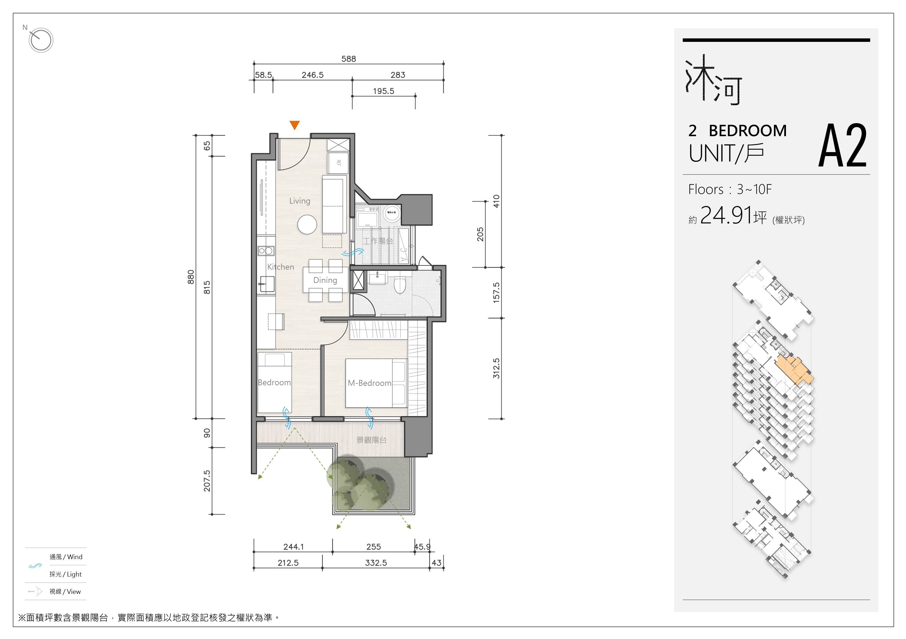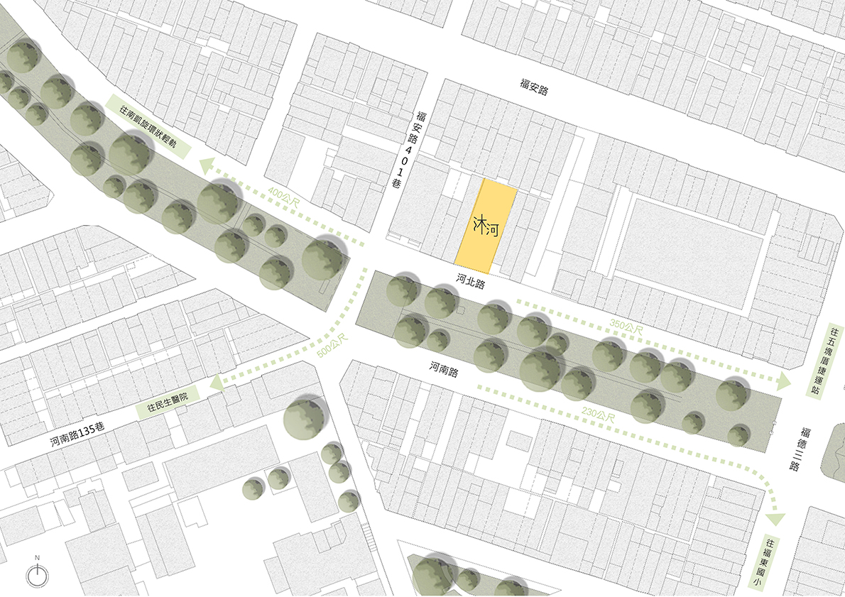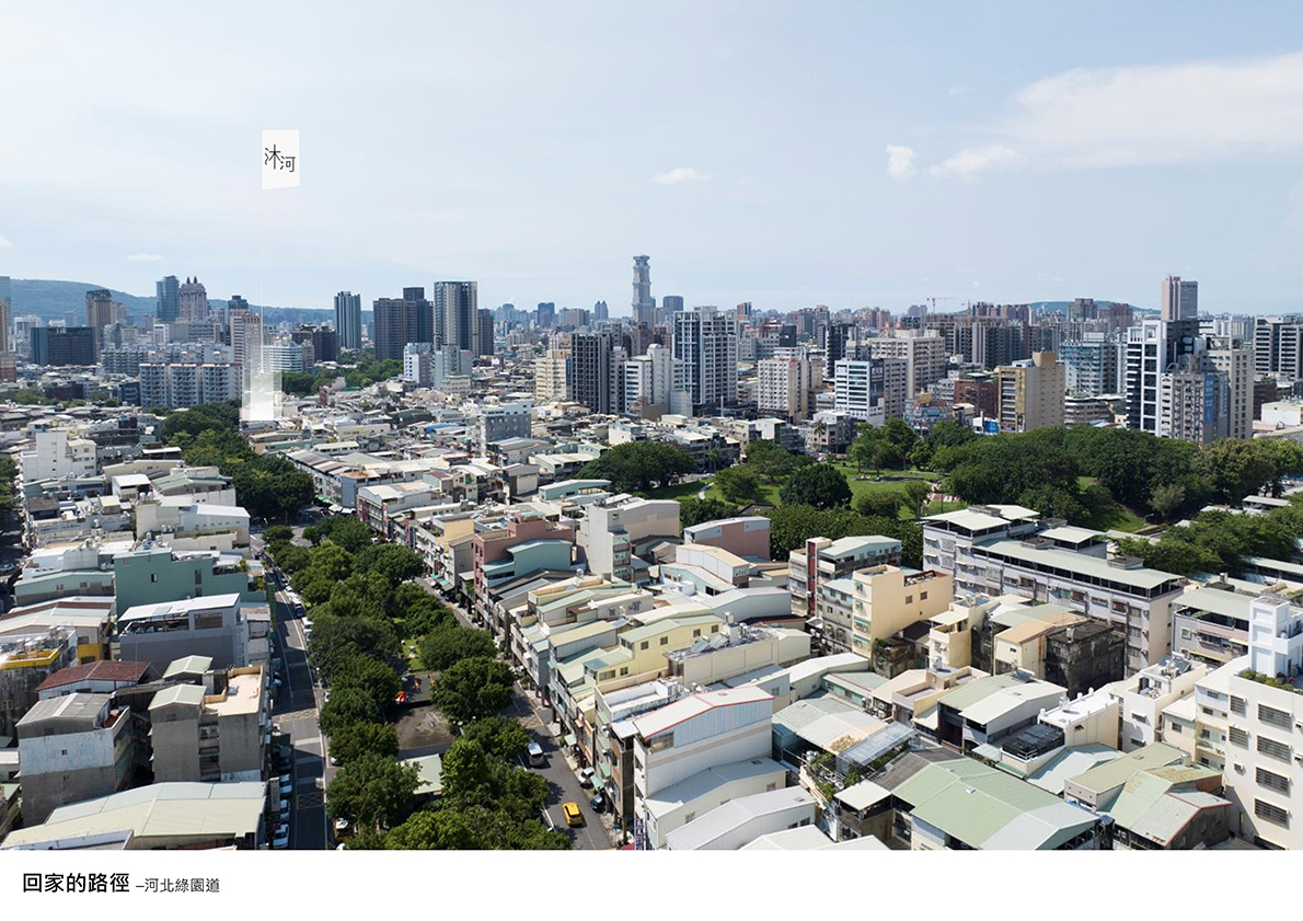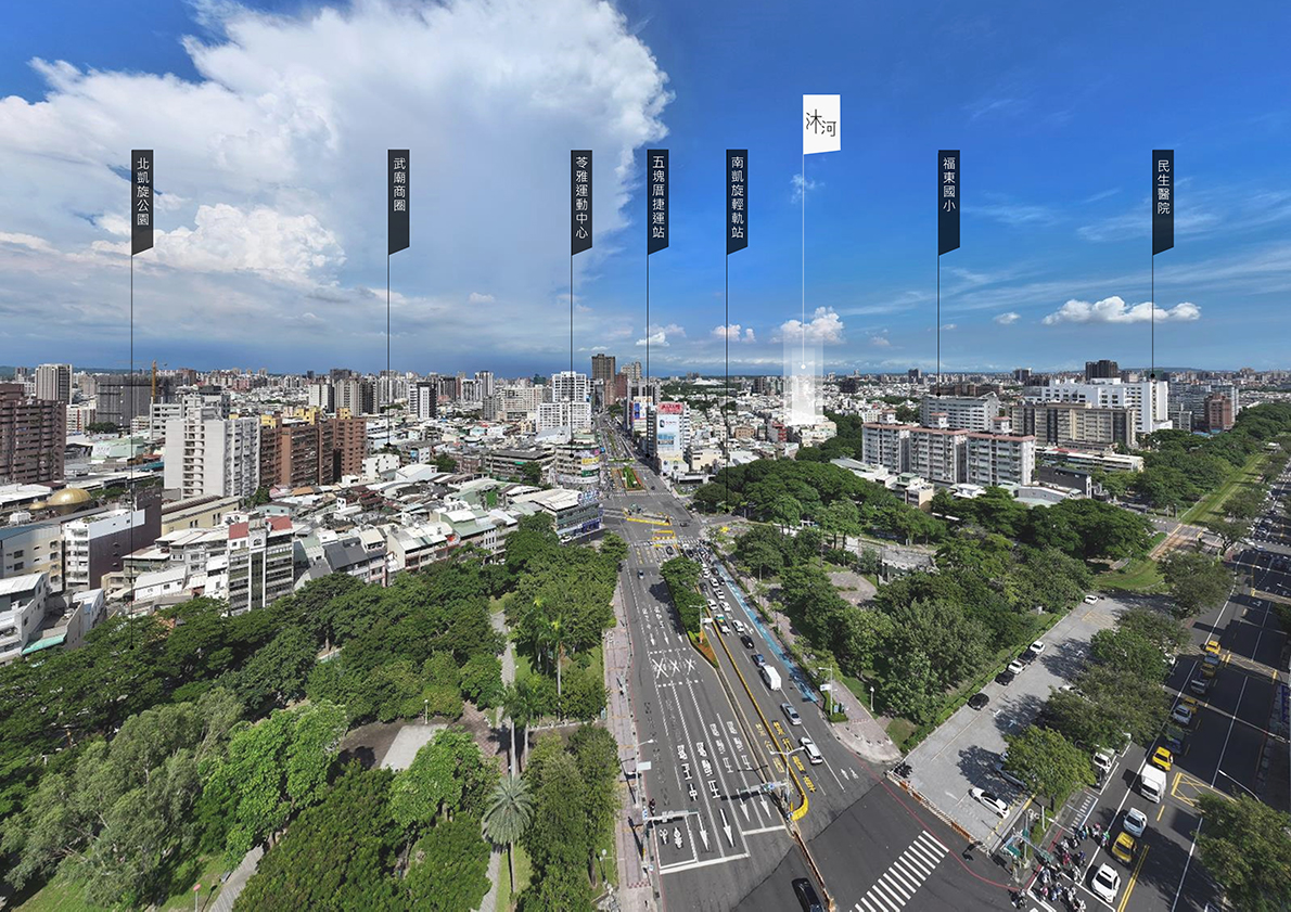 明森建築將本案取名「沐河」,以層次分明的白色建築和諧於藍天、沐浴於河北路上的綠色廊道,以白色為畫布,陽光陰影自然地展現建築的樣貌。