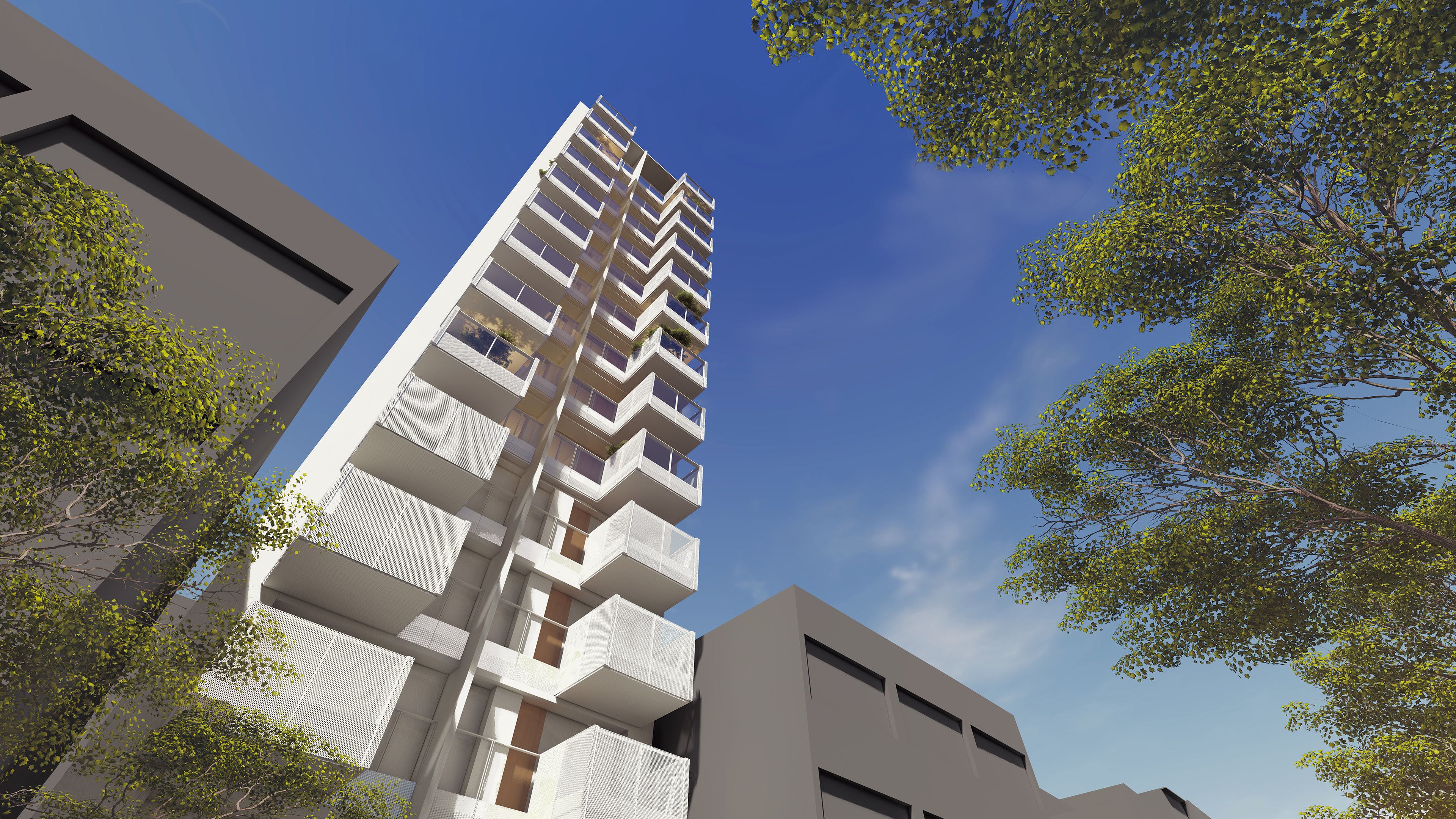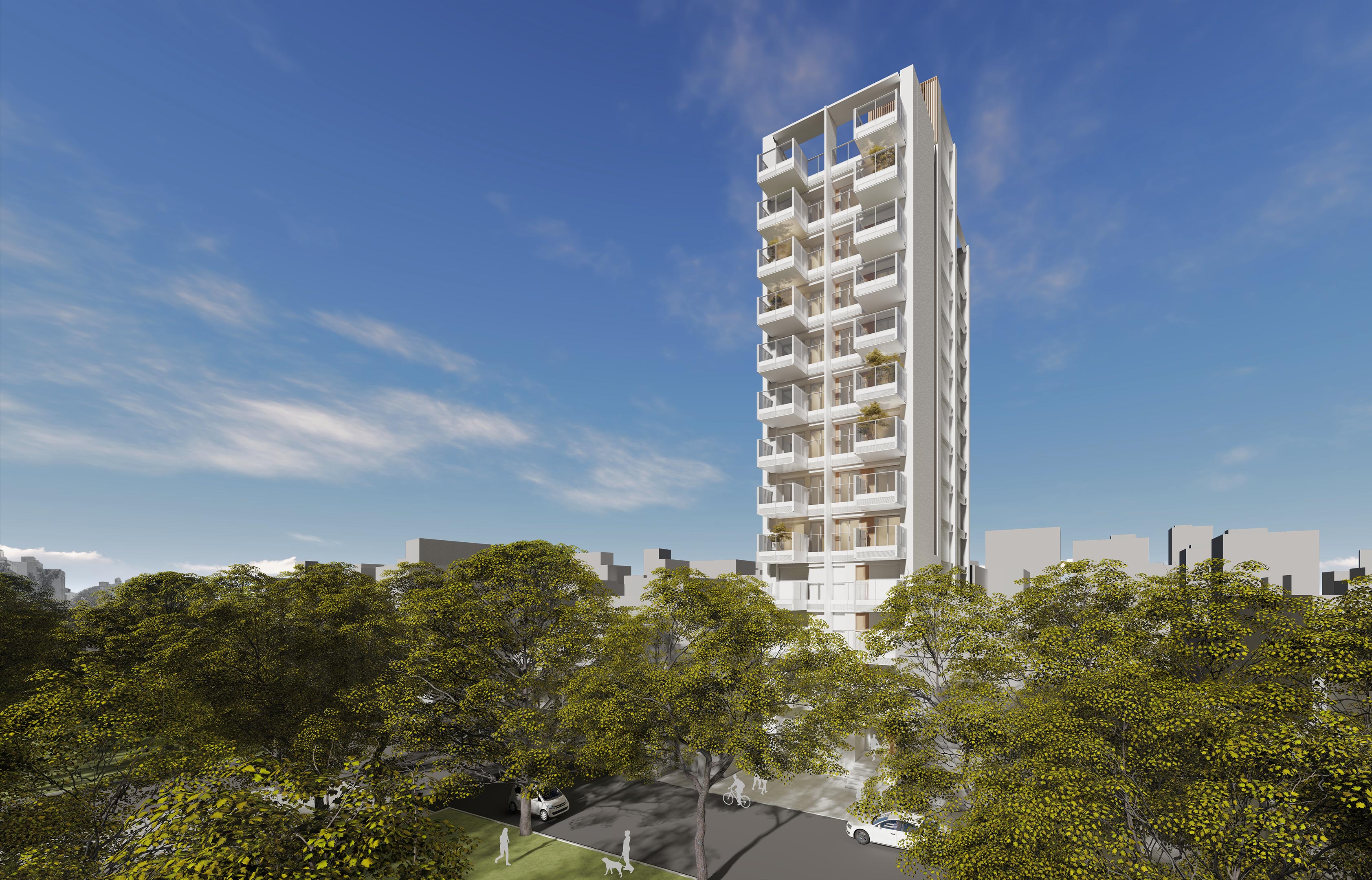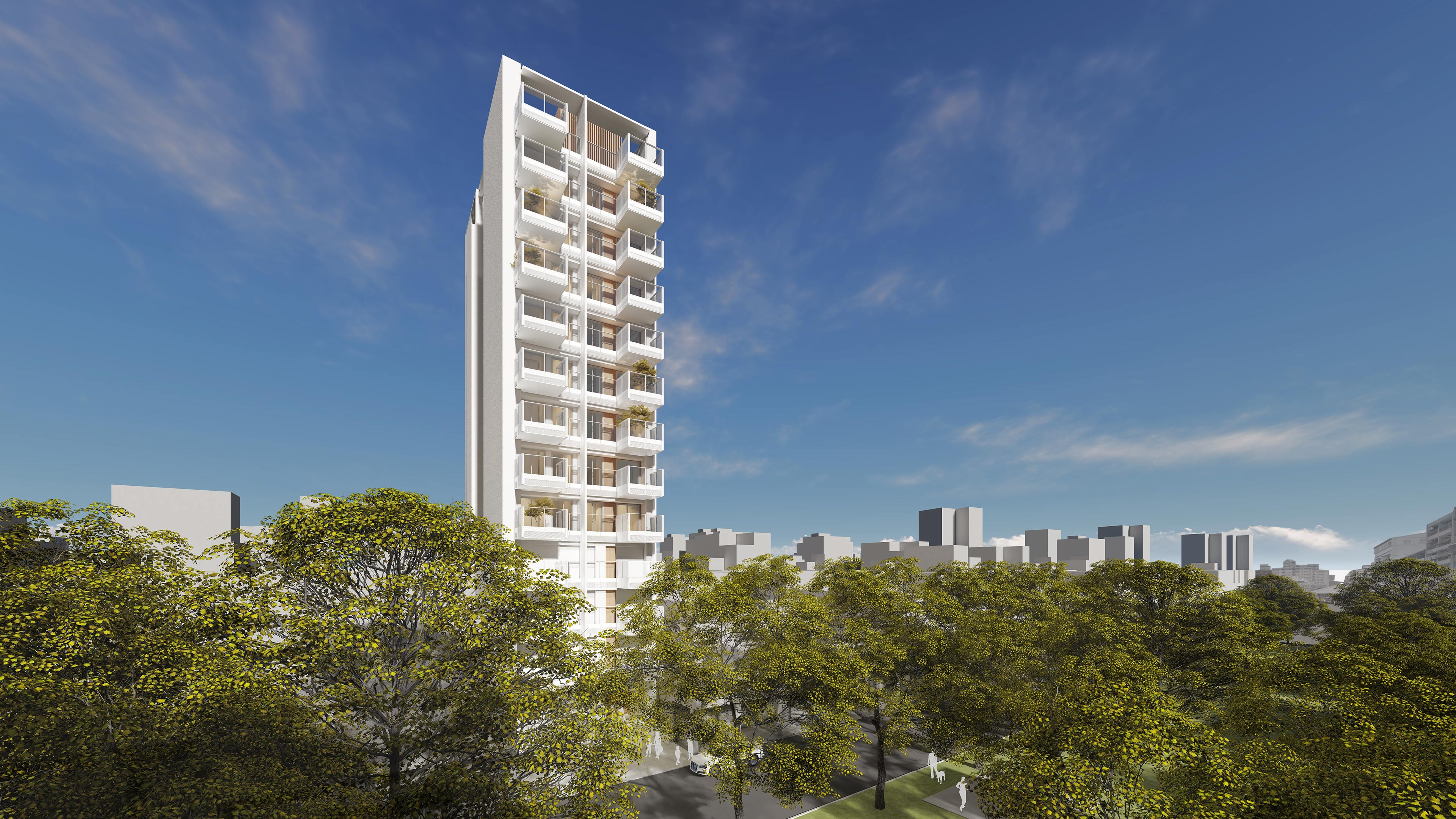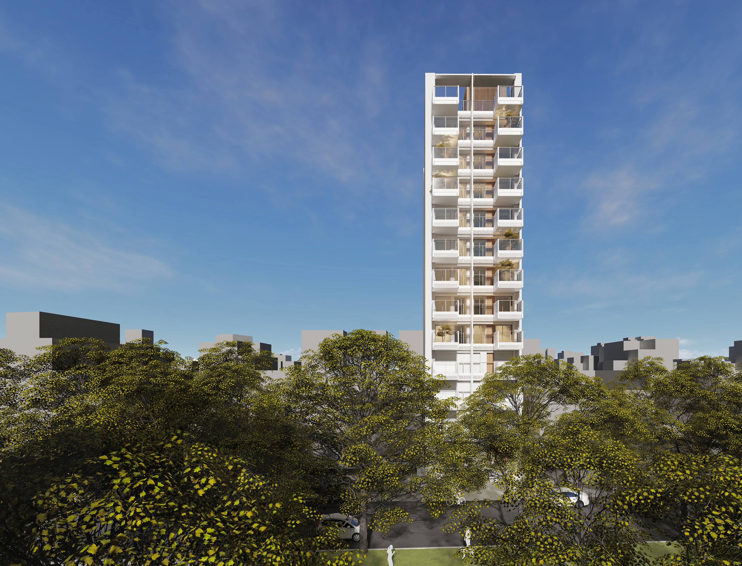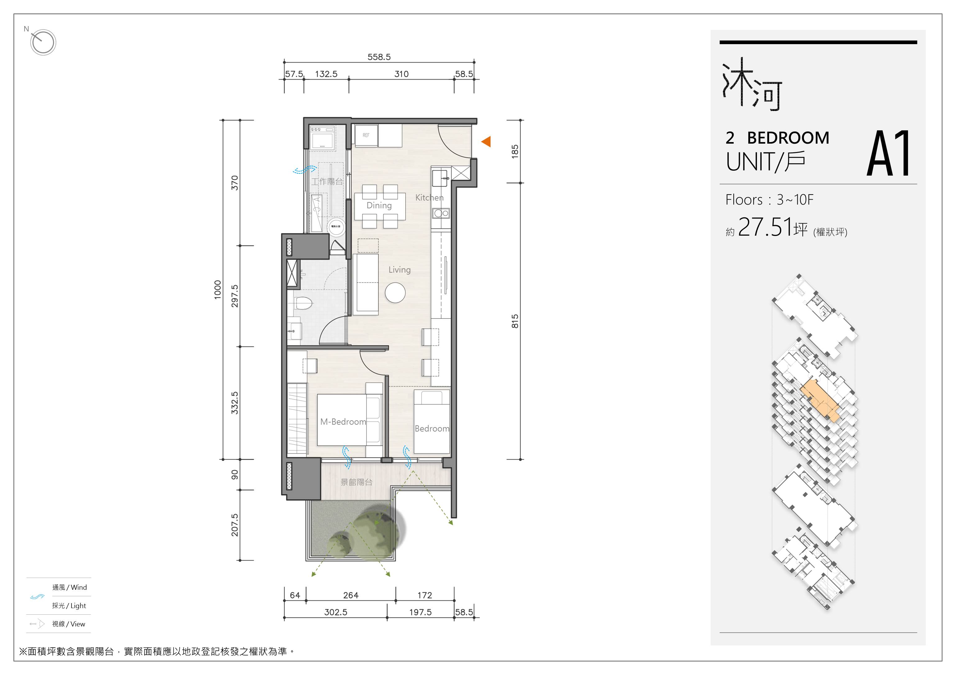 明森建築將本案取名「沐河」,以層次分明的白色建築和諧於藍天、沐浴於河北路上的綠色廊道,以白色為畫布,陽光陰影自然地展現建築的樣貌。