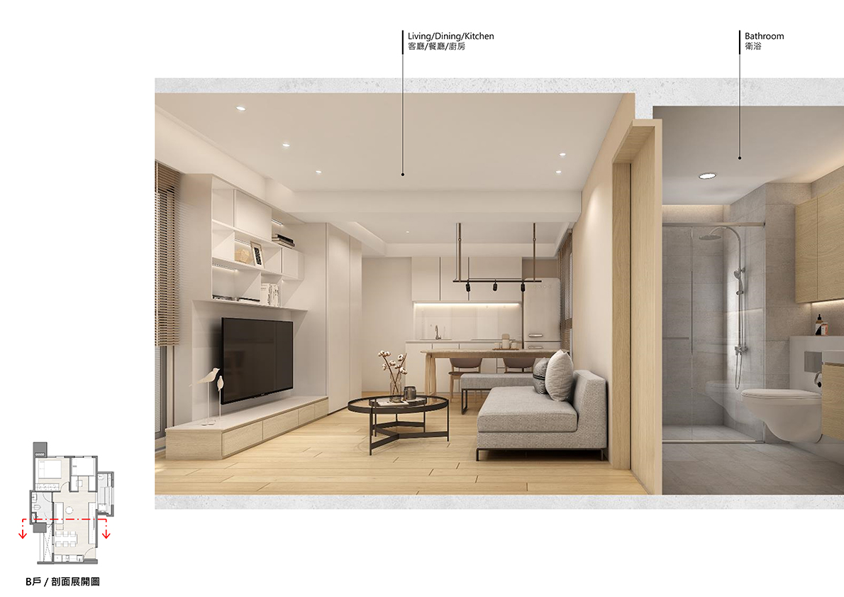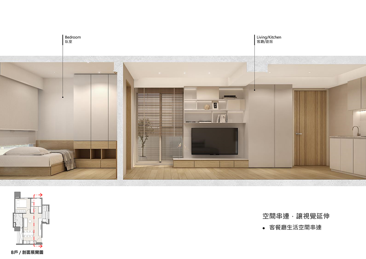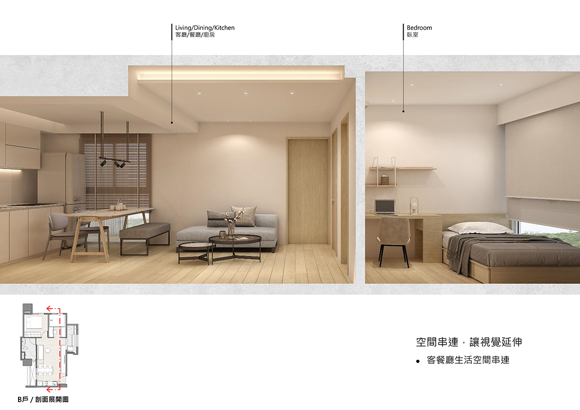 平面設計思考的同時,建築與室內空間同時並進,當您進入屋內,精巧的空間設計,沒有封閉的牆角,使得柔和的光線能夠透過陽台及窗戶進入室內,沒有過多的裝飾,一切美好源於自然,侘寂之美油然而生 !