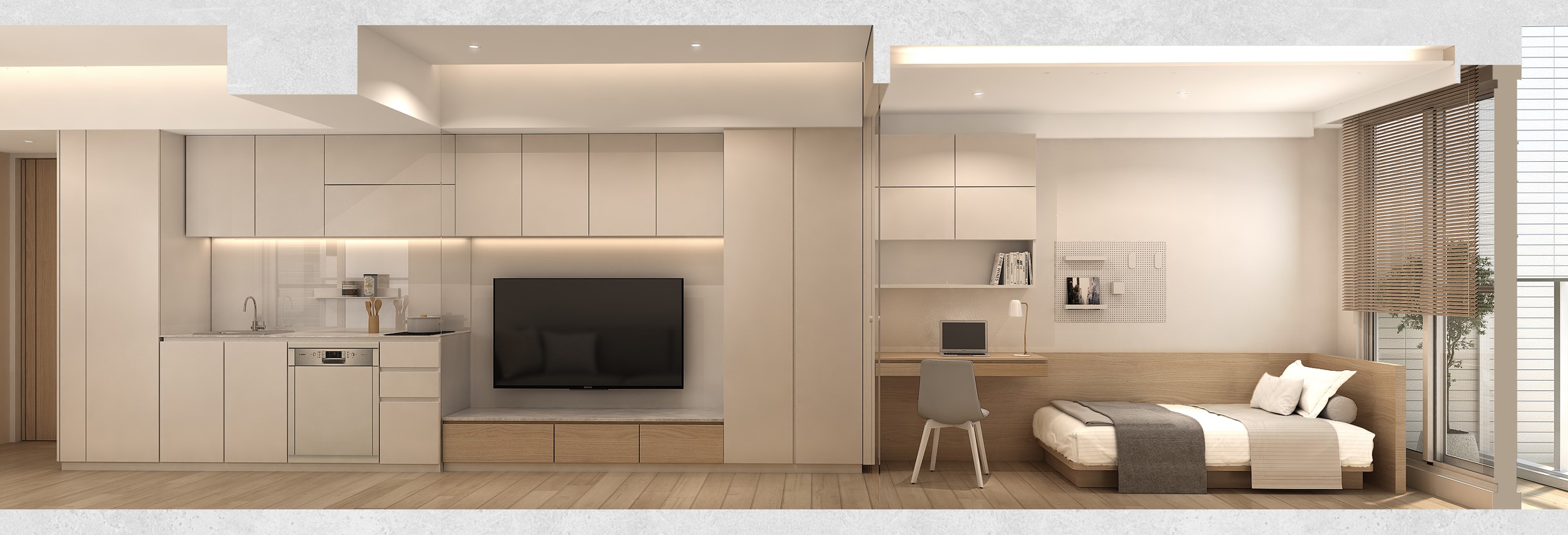 「切割空間屬性」但不封閉空間界線,例如;links of LDKS(客廳living、餐廳dining、廚房kitchen、書房study)串連。「切割立面」,但不劃分屬性,例如:充滿機能性的牆嵌入牆面,房門呼應著牆面的延伸,達到視覺尺度放大的效果,如櫃子般的門(隱藏門)、純粹的白牆、溫潤的白橡地板、虛實俐落、超強收納、流暢的動線與內外交融的空間,讓室內延伸至戶外(陽台),不界定內外空間,突破小空間「狹窄」的刻板印象。