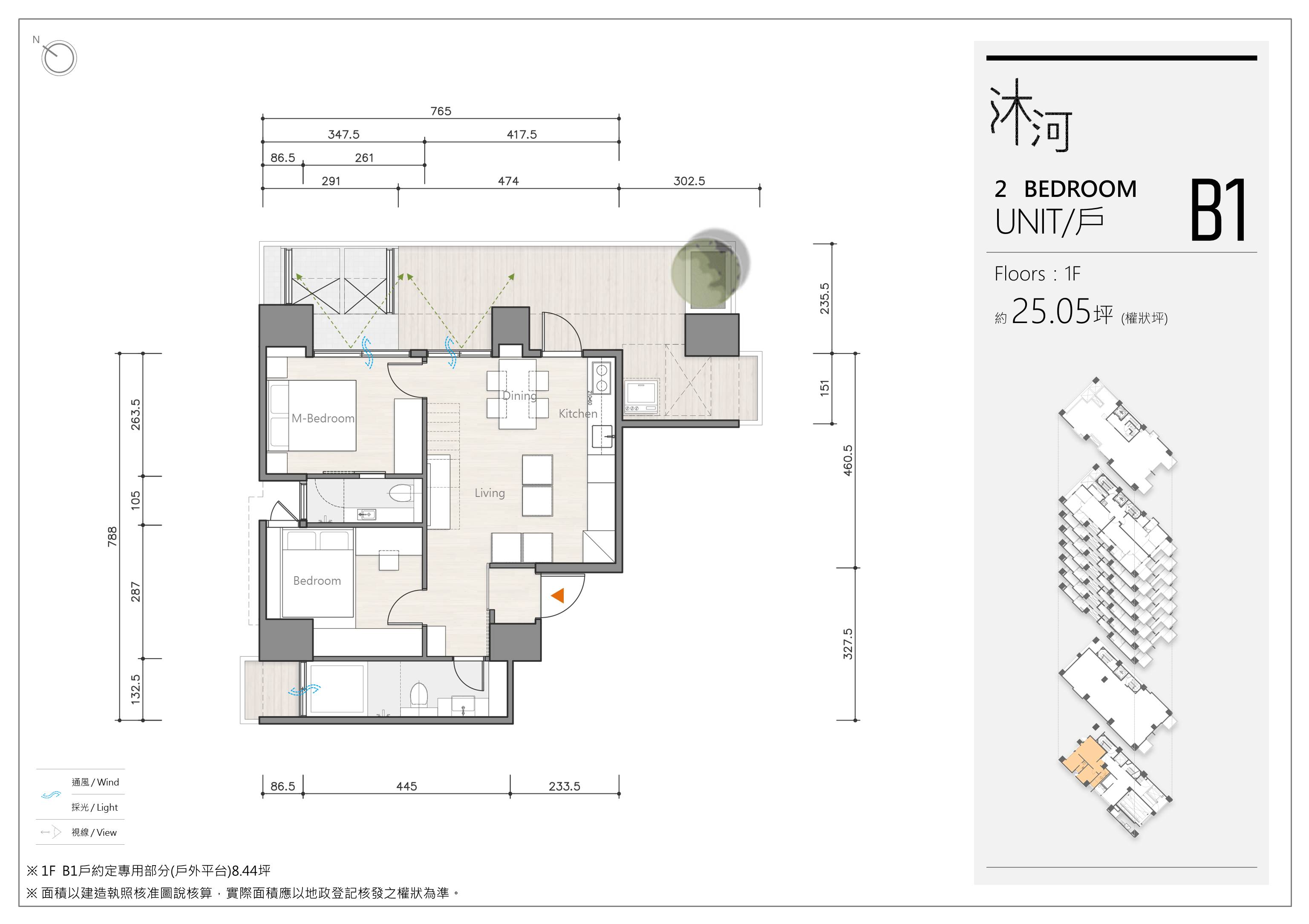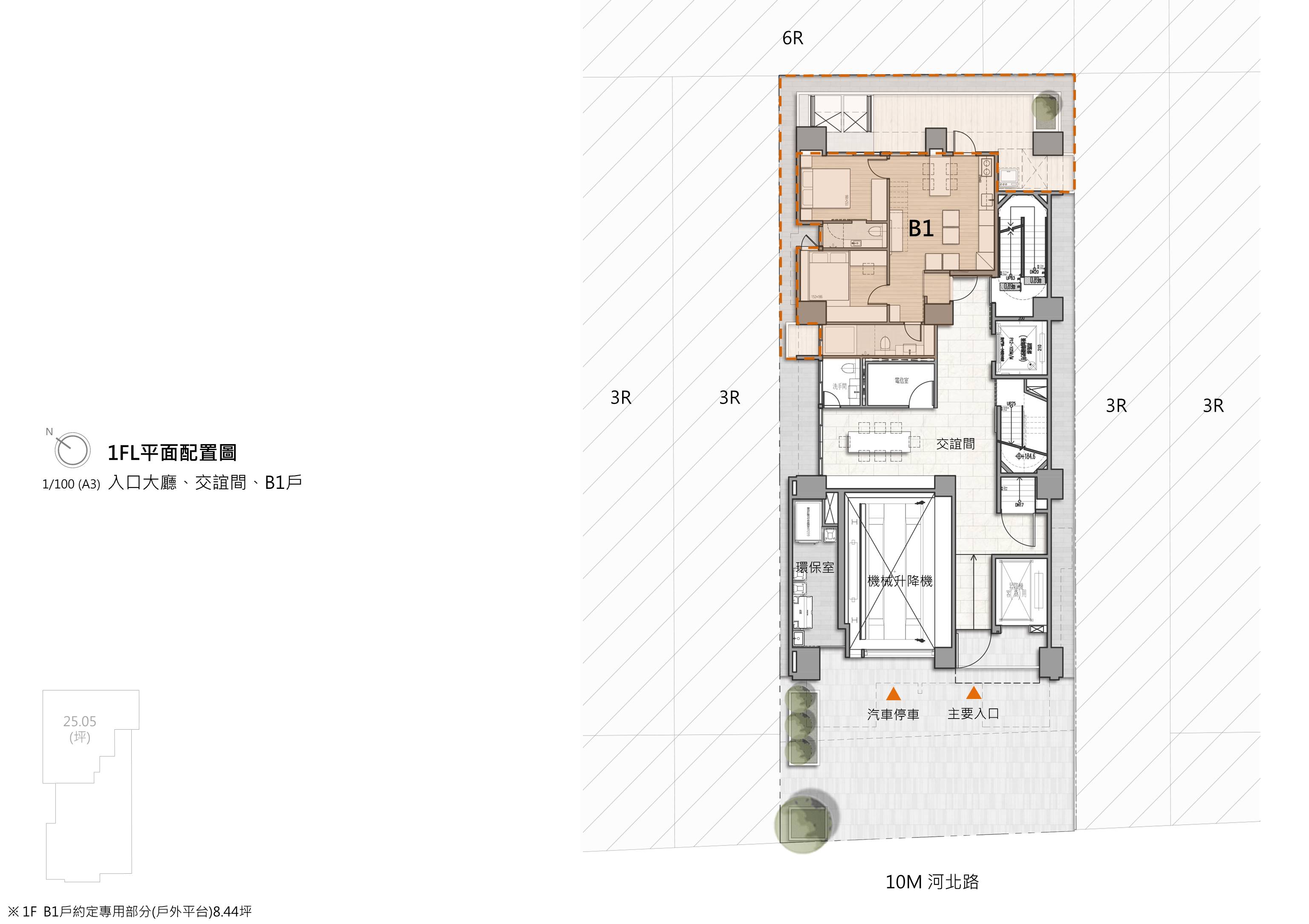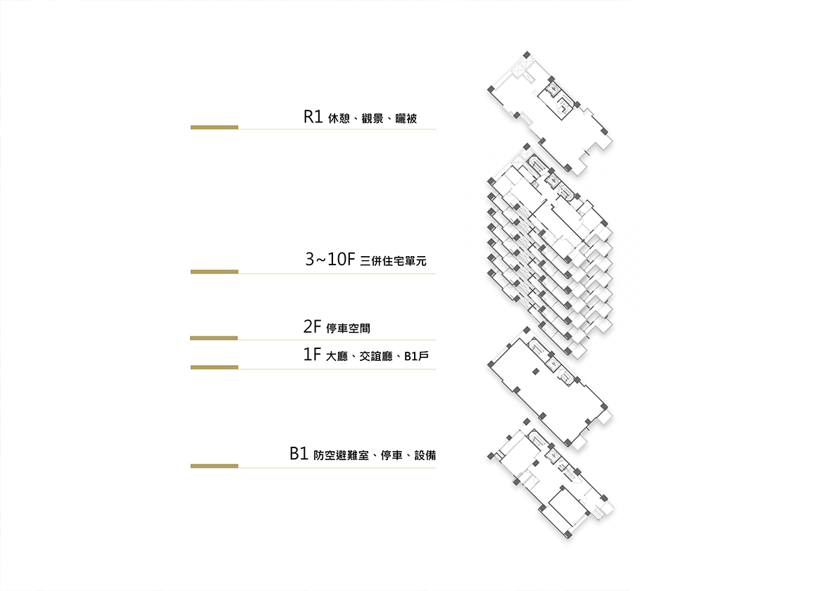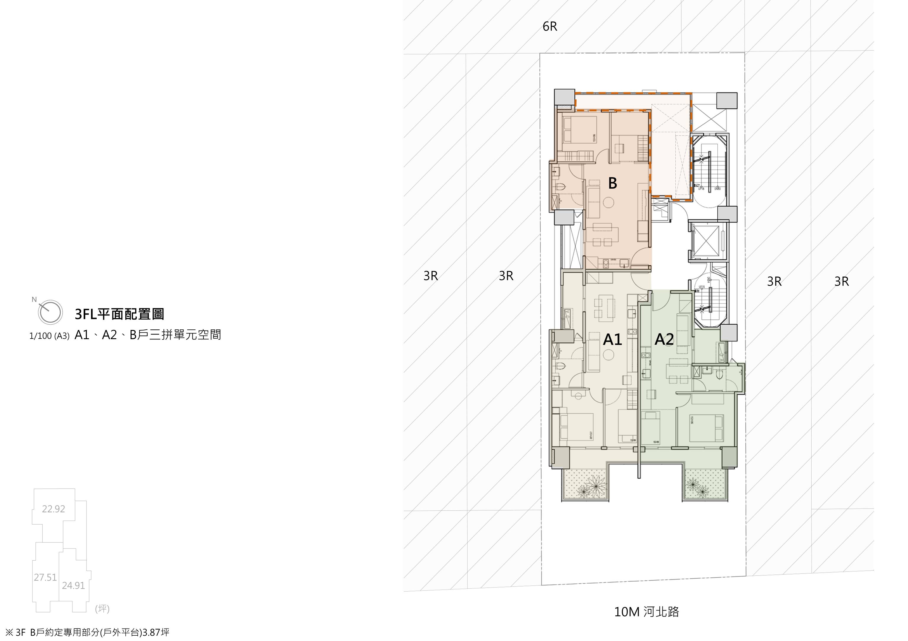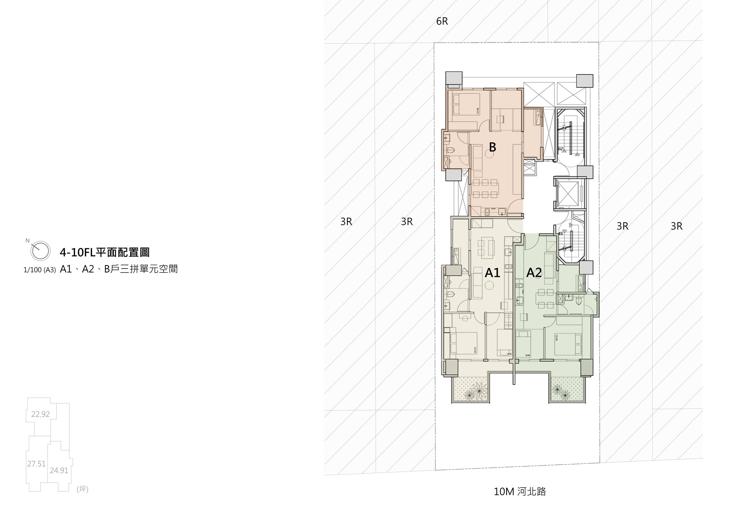 建築規模 / 地上10層,地下1層,樓高3.2m,三拼,共25戶,規劃24個倉儲車位。各戶權狀坪約: A1戶27.51坪、A2戶24.91坪、 B1戶25.05坪、B戶22.92坪 (註:有關銷售面積、外觀、平面配置..等,僅供參考,實際以銷售合約為主。)