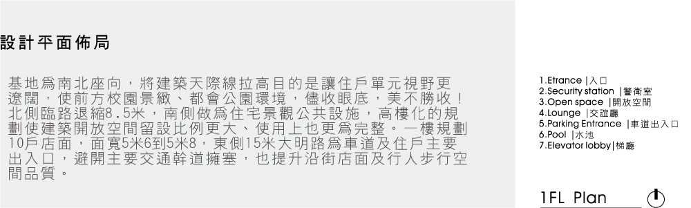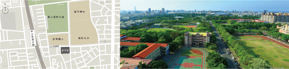 本案位於高雄市鳳山區二十米新富路上,東與鳳山鬧區相鄰,西側二聖路可直達高雄市區,南北五公里內皆有交流道可直上中山高速公路,地理位置在交通上四通發達。基地正對新甲國小、鳳新高中、再往北延伸為鳳甲國中,學區國小到高中都屬明星學校,對於有學童家庭來說,通學及升學環境都相當便利。