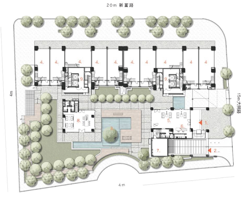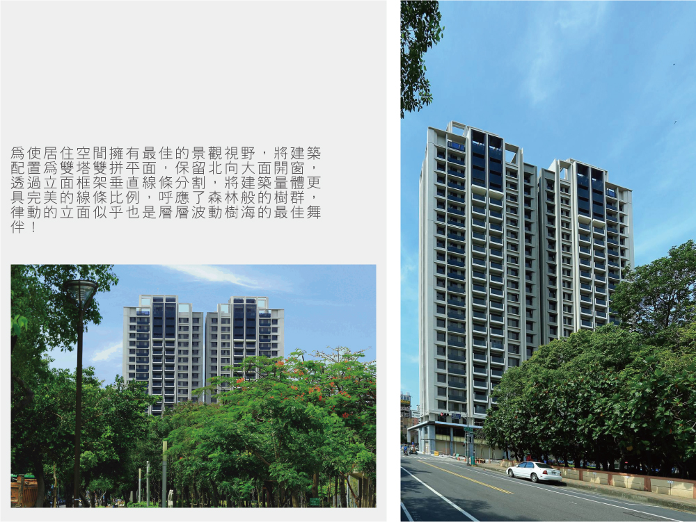 基地周遭皆為低樓層的校園建築,採低建蔽率高樓化建築有利於環境的貢獻,也讓本案擁有極大的棟距,校園的戶外操場及綠地創造環境的開闊性,高樓層景觀可延伸至衛武營都會公園,使此案在景觀視野有著絕佳獨特條件。