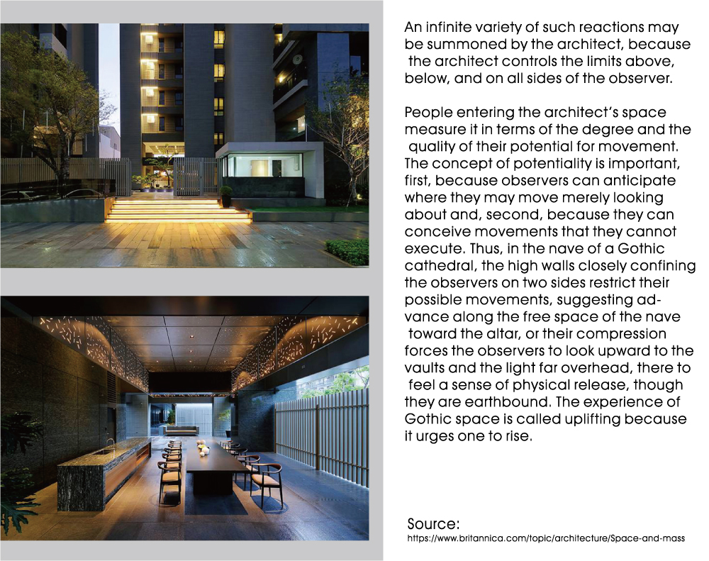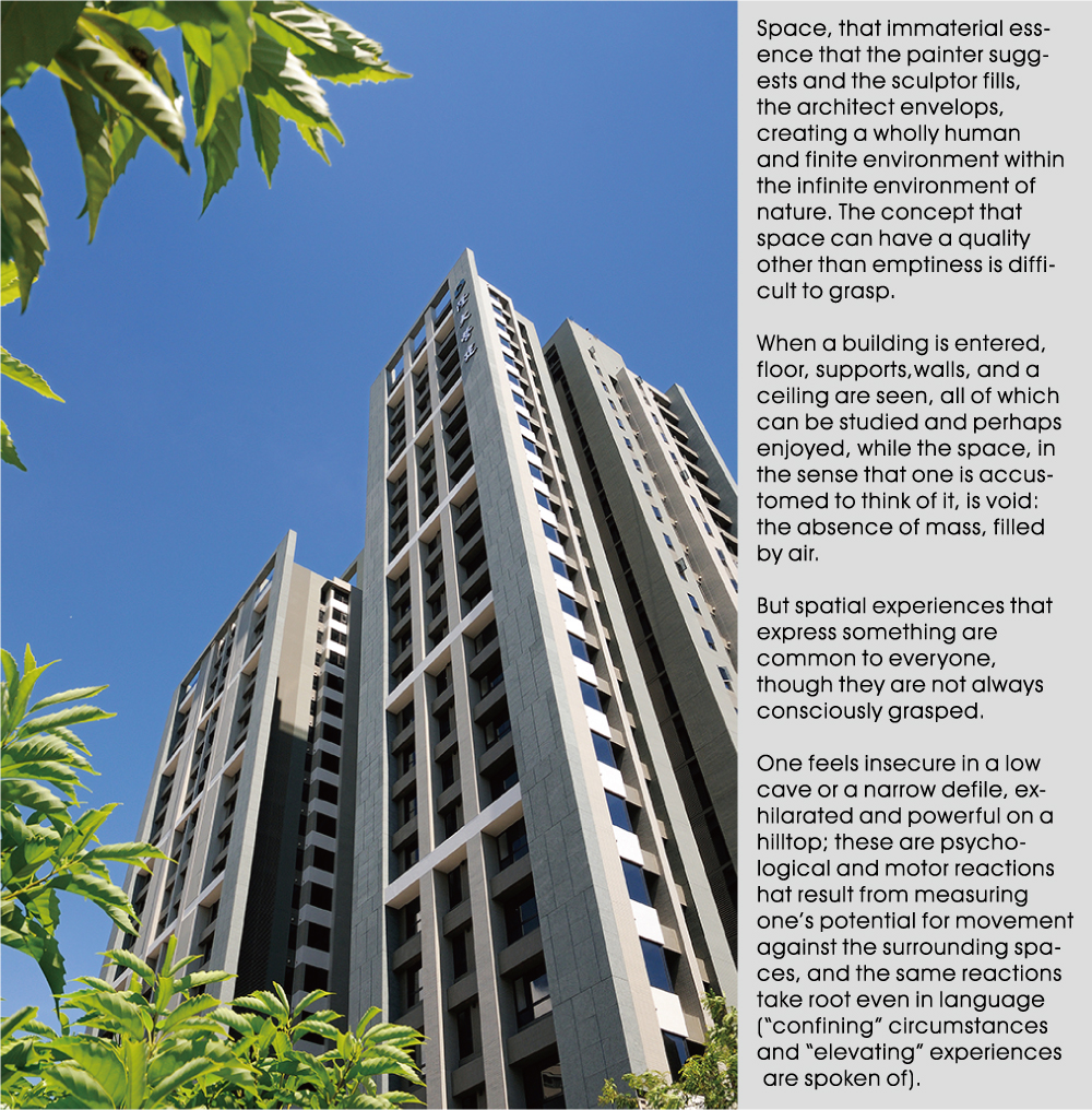 對人而言;「建築的目的是創造居住的幸福」。我們認為「幸福」才是住宅的前提,不只是可量化的地段、坪數、建材。如果住宅只用量化的手法去建構幸福,難免失去了建築的本質,即「空間」。當「空間」不是主角時,無謂的造型語彙將佔滿人類的感官神經系統。