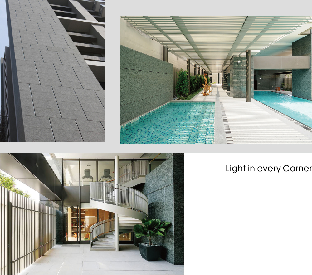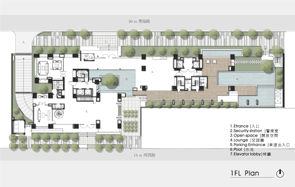 以情境創造景觀哲學,將整個基座淨空、挑高,將空間視覺由外部拉到基地最大進深,讓光線灑進一樓的任何角落。除結構所需,不容任何一道牆阻隔,無須界定是戶外還是室內……
