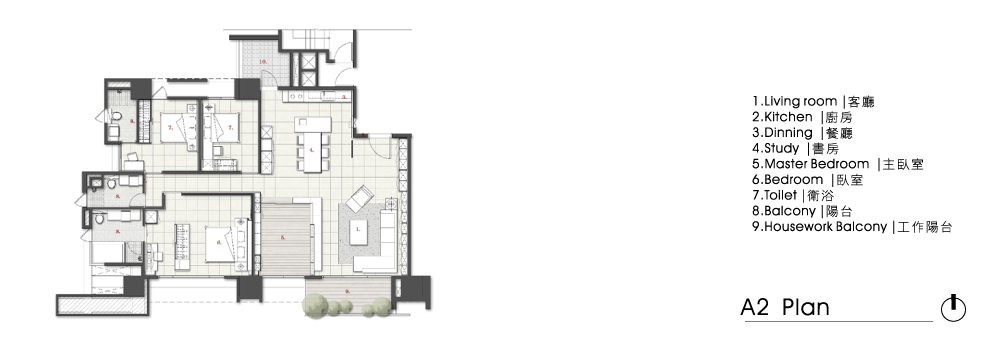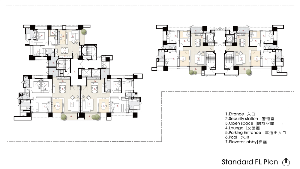 「本案位處美術館特區的最南端,基地為南北座向、面寬九十公尺,因此九十米林蔭大道成了迎賓入口,將綠意填滿低樓層的窗,讓每個空間能「開窗即景」!而高樓層可眺望西南向的中都濕地公園……。在晨曦,壽山青翠映映;在黃昏,愛河波光粼粼;於夜晚,市區燈火點點……,任何時段皆能將平日世俗煩擾拋到九霄雲外。此外,愛河蜿蜒、擁抱中都濕地,亦能欣賞夕陽躲在壽山之後,漫射光芒、暈染於愛河的絕佳角度!