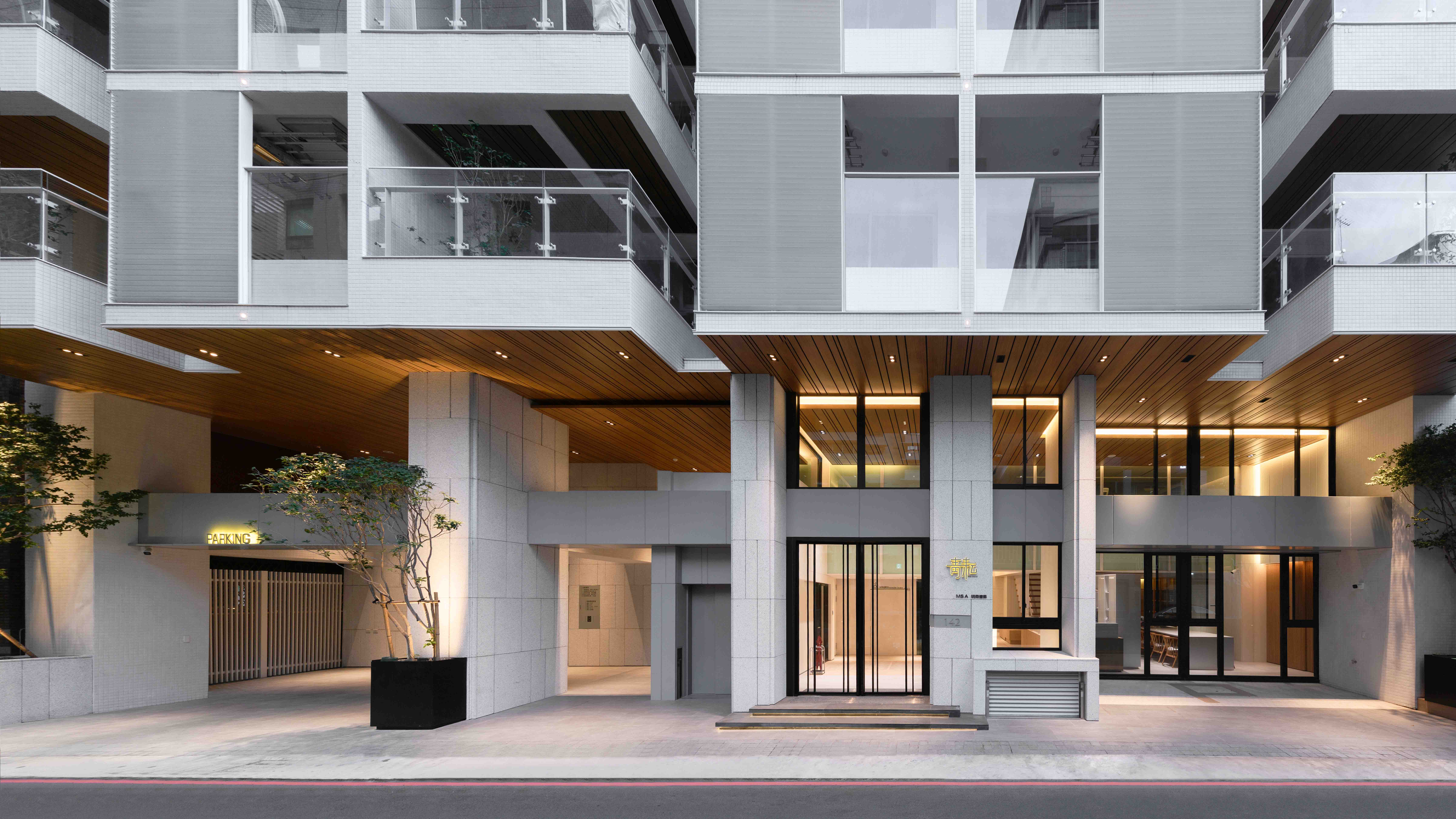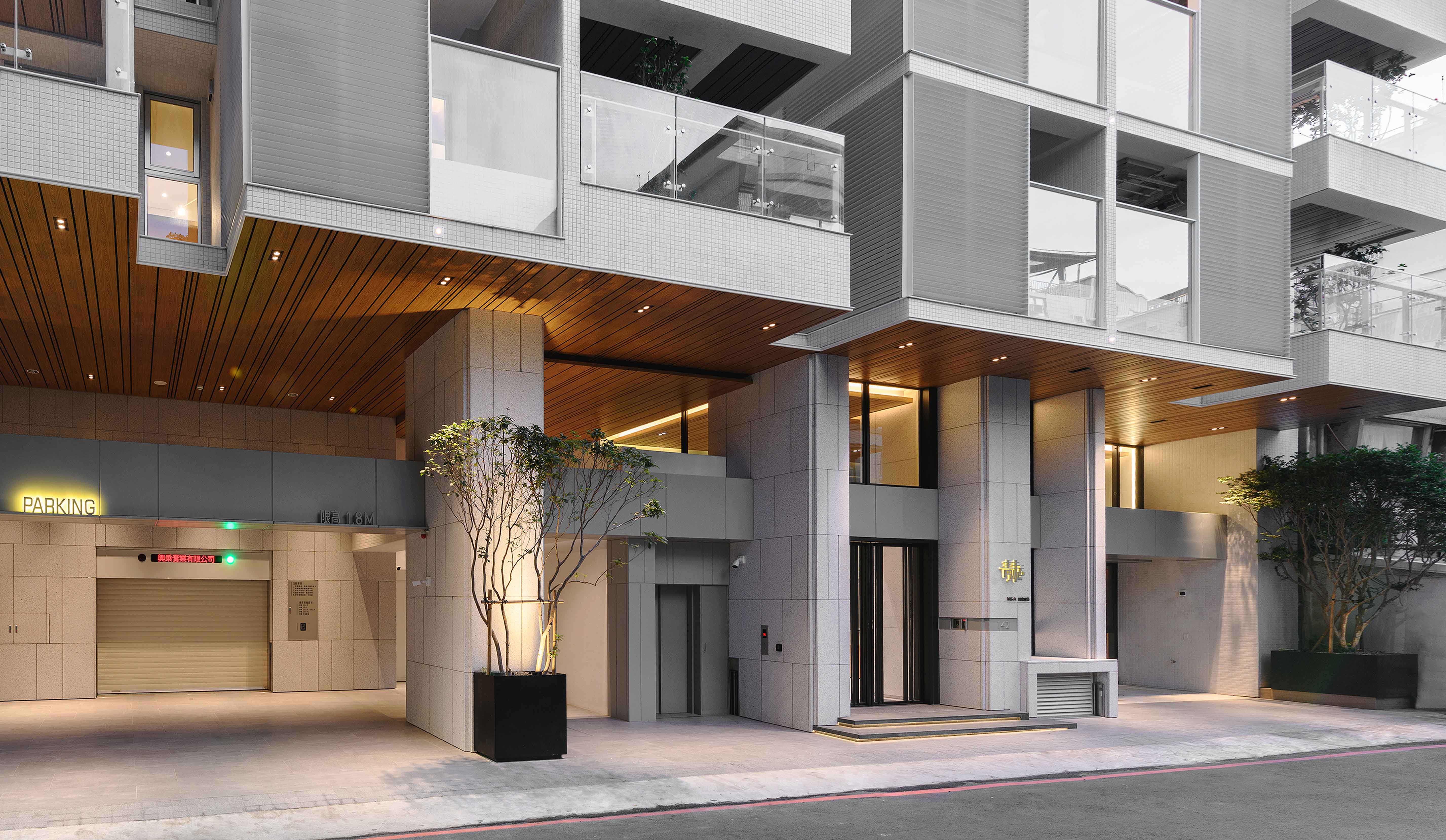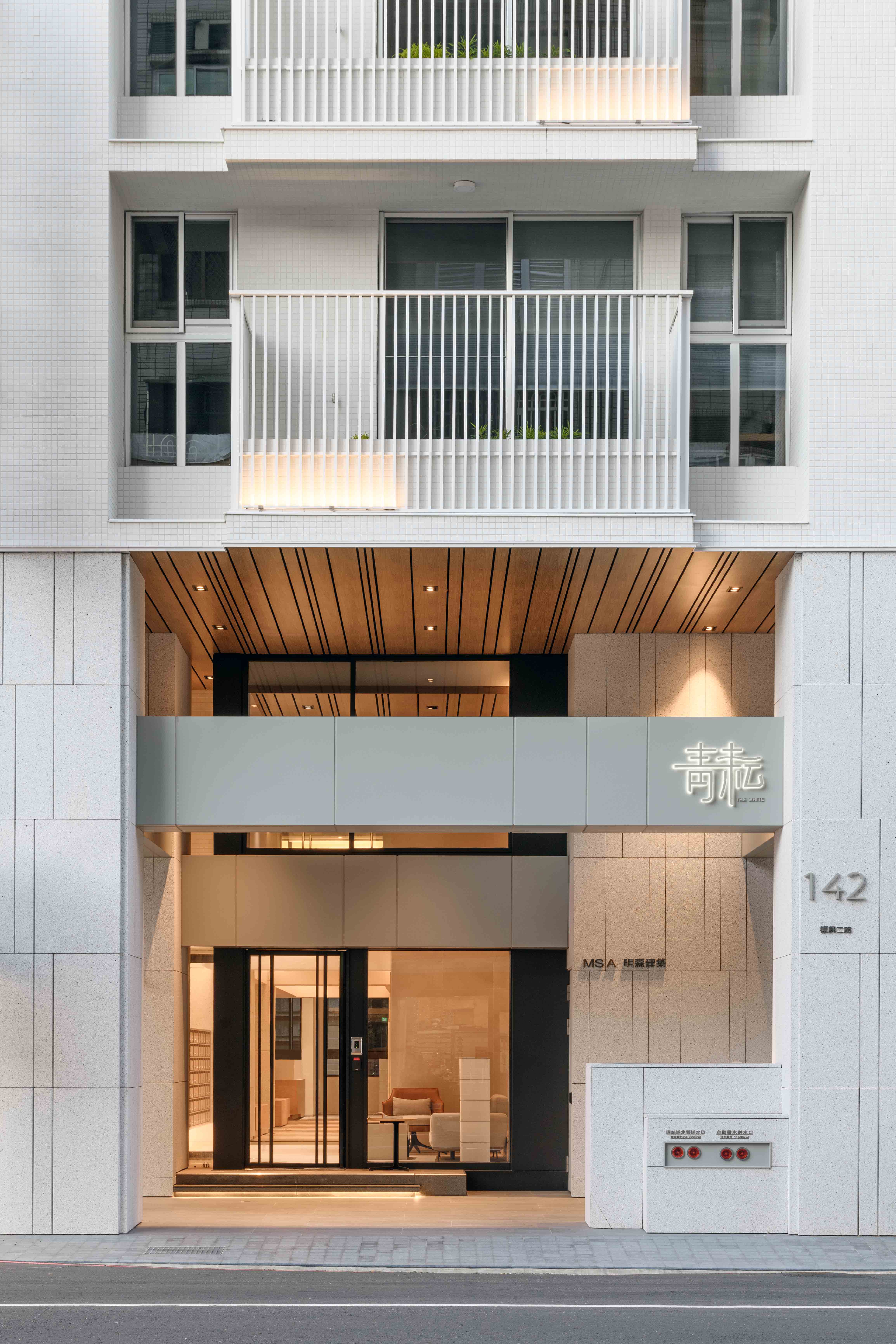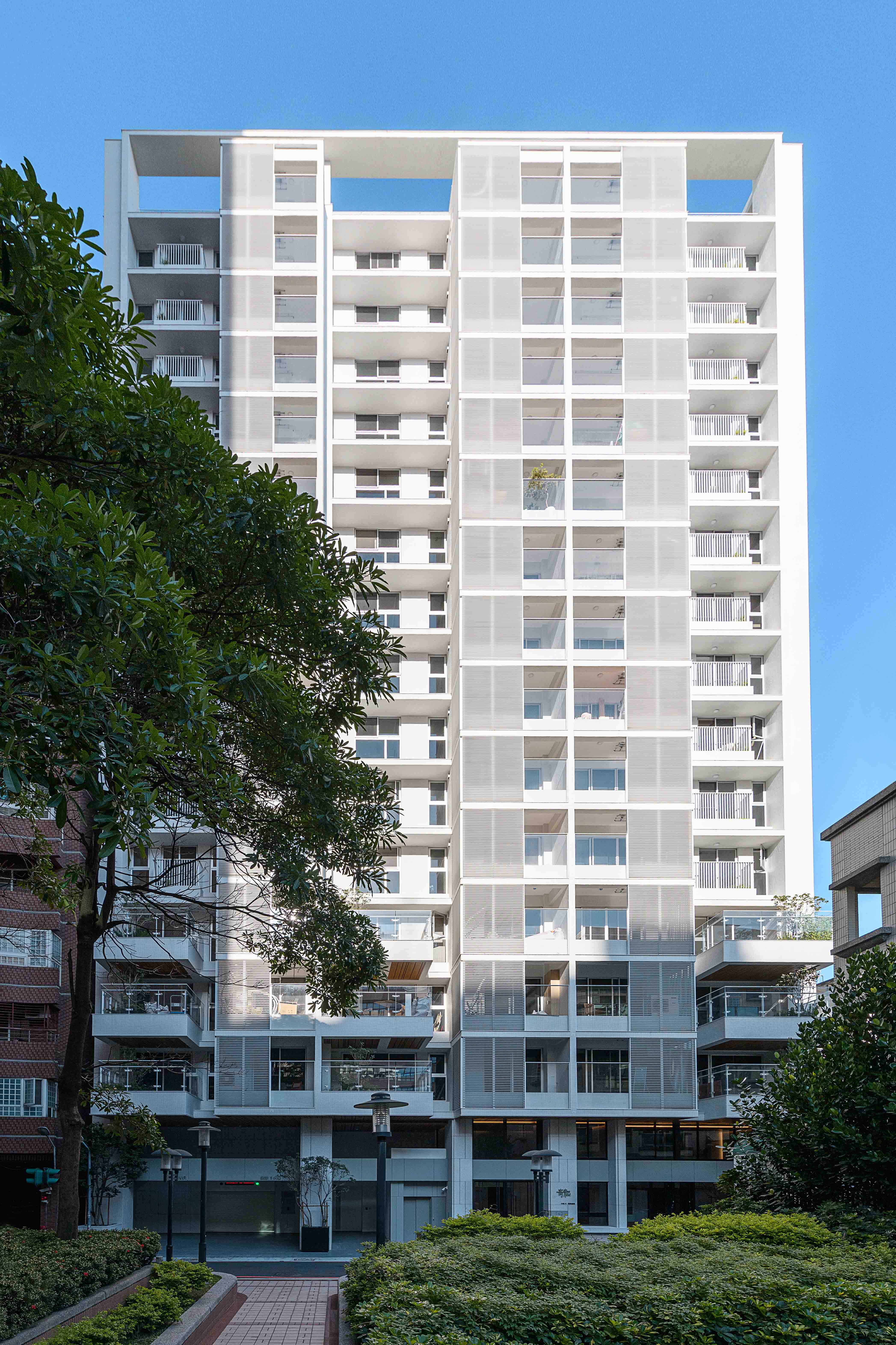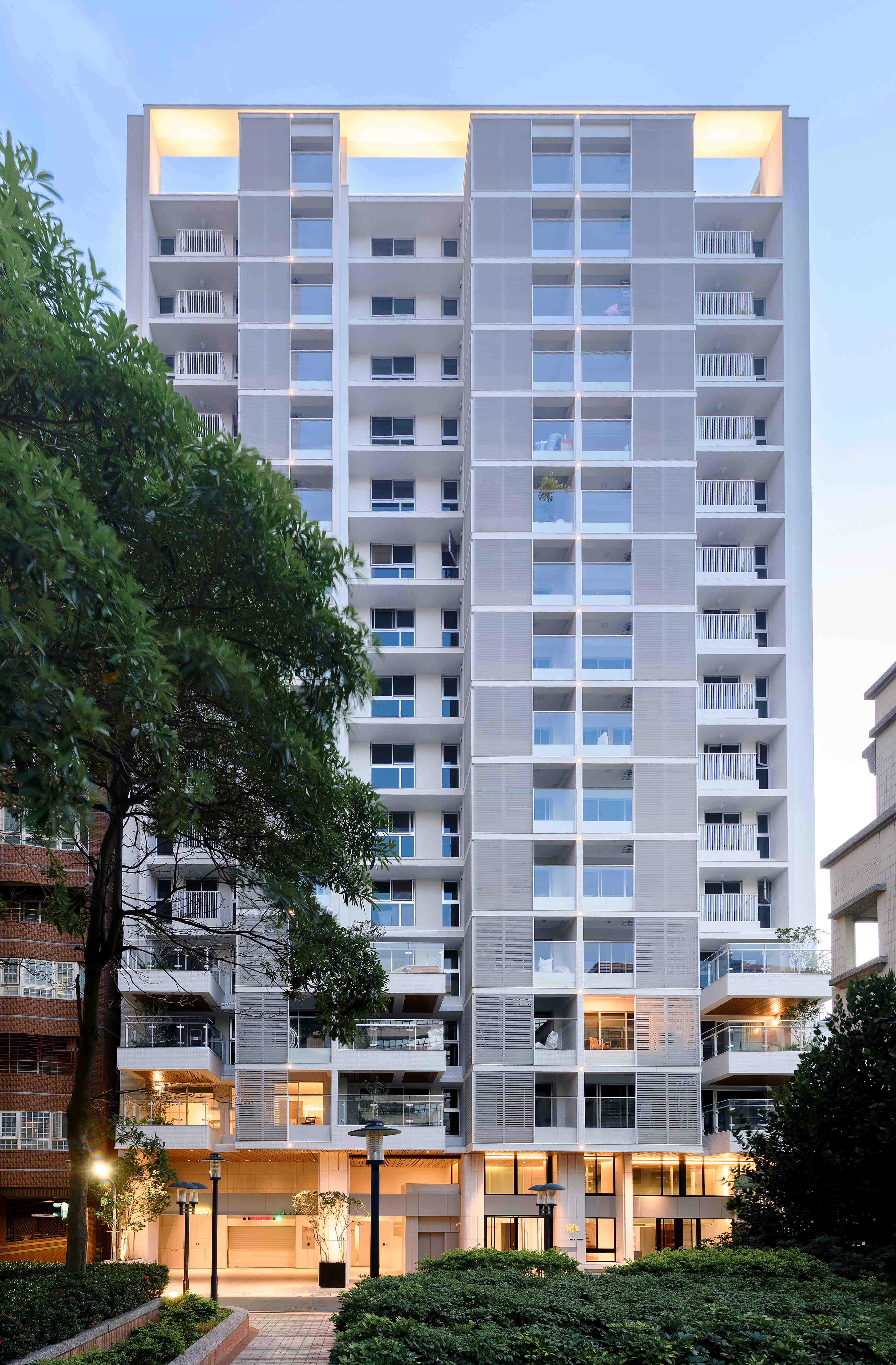 全棟採白色外牆⋯白色欄杆、水平格柵切割立面,使量體產生強大的立體效果,除了創造自然的陰影表情之外,也反映地域氣候特性,因為隔熱遮陽性能是亞熱帶地區建築應該呈現的外觀語彙,且白色最具環境滲透力,並有效降低外殼耗能量(低吸熱),同時滿足造型、色澤;並兼顧氣候特性謂之「風土建築」。在全球環保綠思潮之下,此觀點將成為現代建築設計手法最重要的影響因子,更是建築追求永恆的觀點!