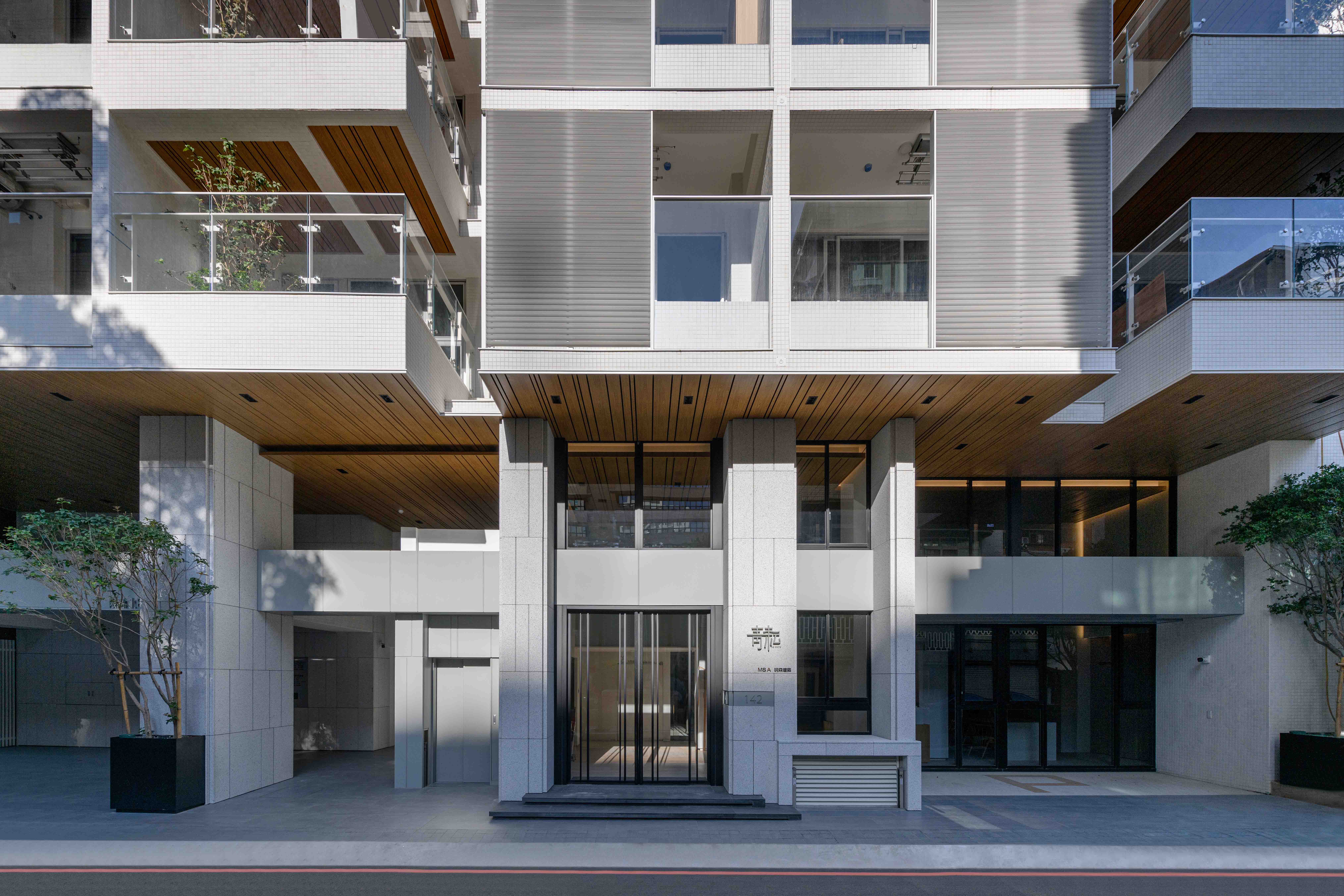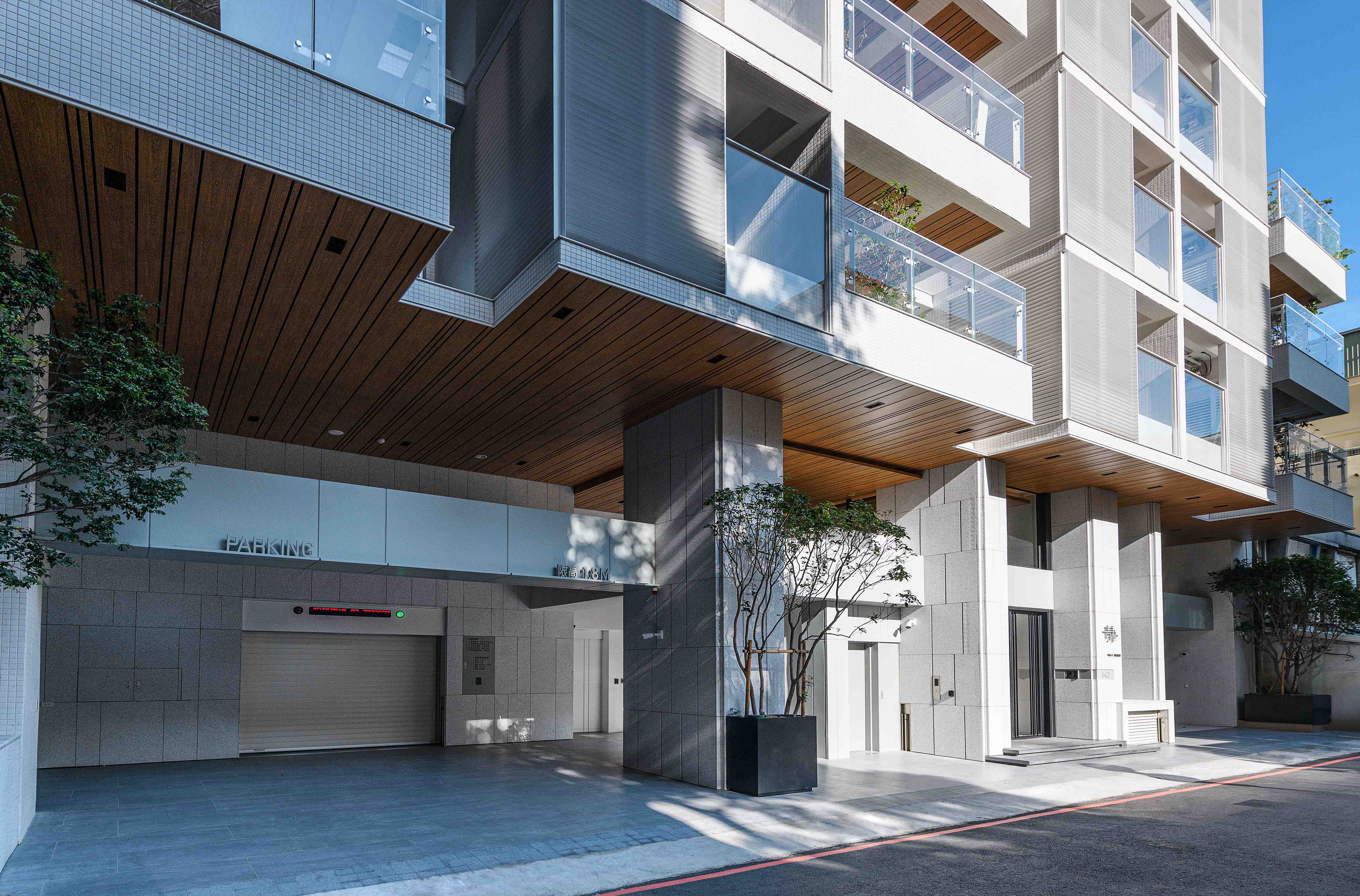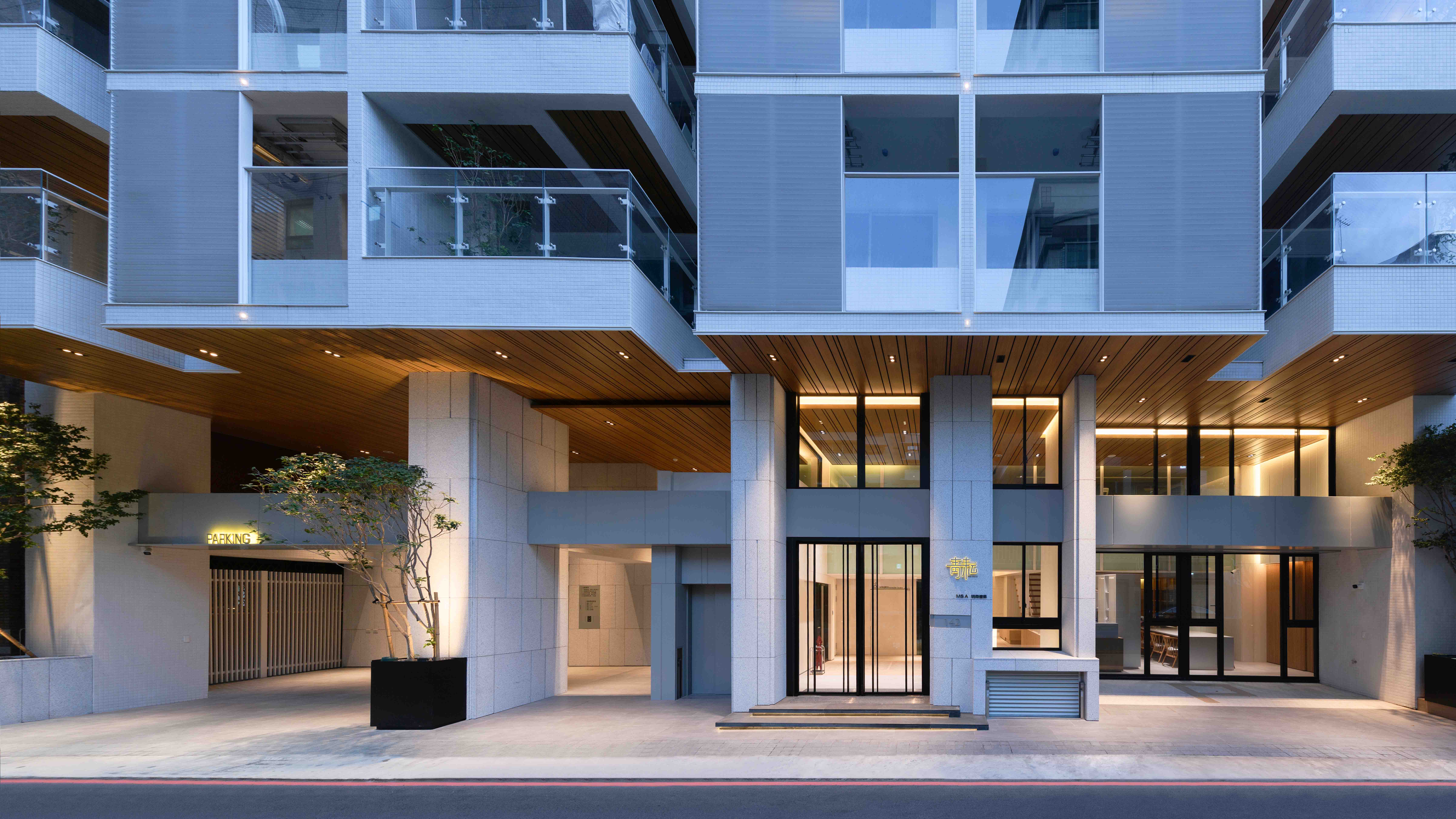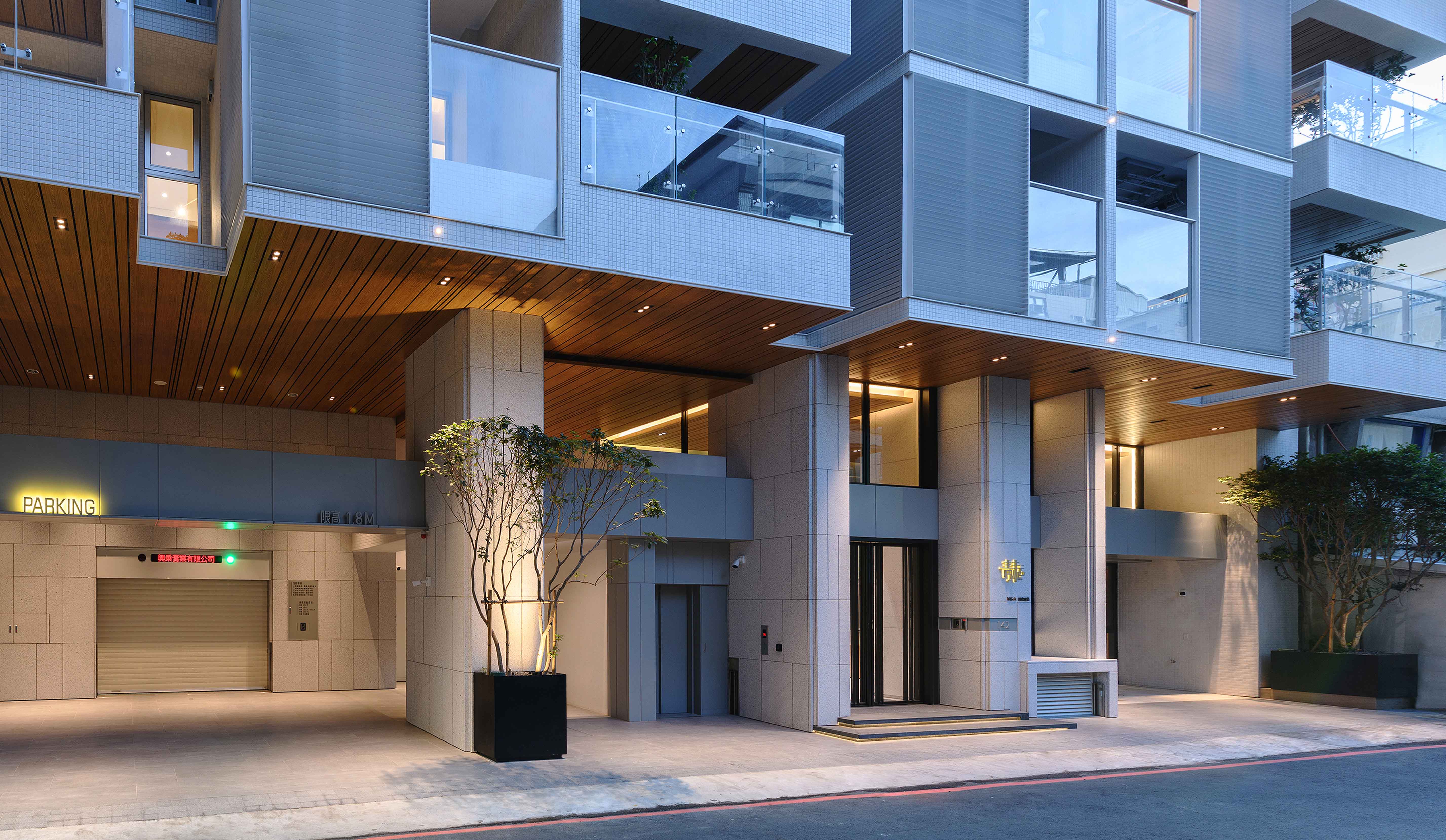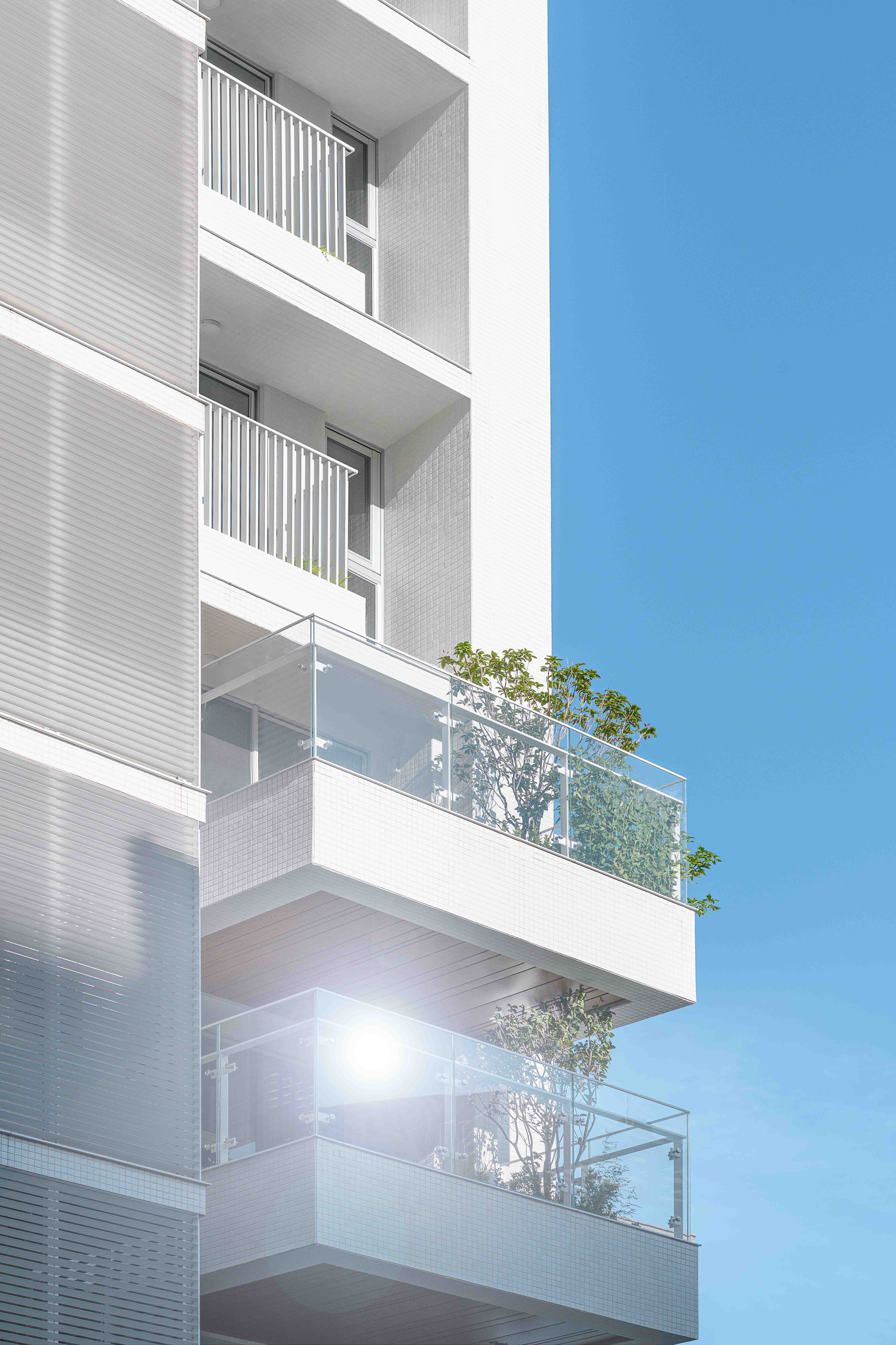 全棟採白色外牆⋯白色欄杆、水平格柵切割立面,使量體產生強大的立體效果,除了創造自然的陰影表情之外,也反映地域氣候特性,因為隔熱遮陽性能是亞熱帶地區建築應該呈現的外觀語彙,且白色最具環境滲透力,並有效降低外殼耗能量(低吸熱),同時滿足造型、色澤;並兼顧氣候特性謂之「風土建築」。在全球環保綠思潮之下,此觀點將成為現代建築設計手法最重要的影響因子,更是建築追求永恆的觀點!