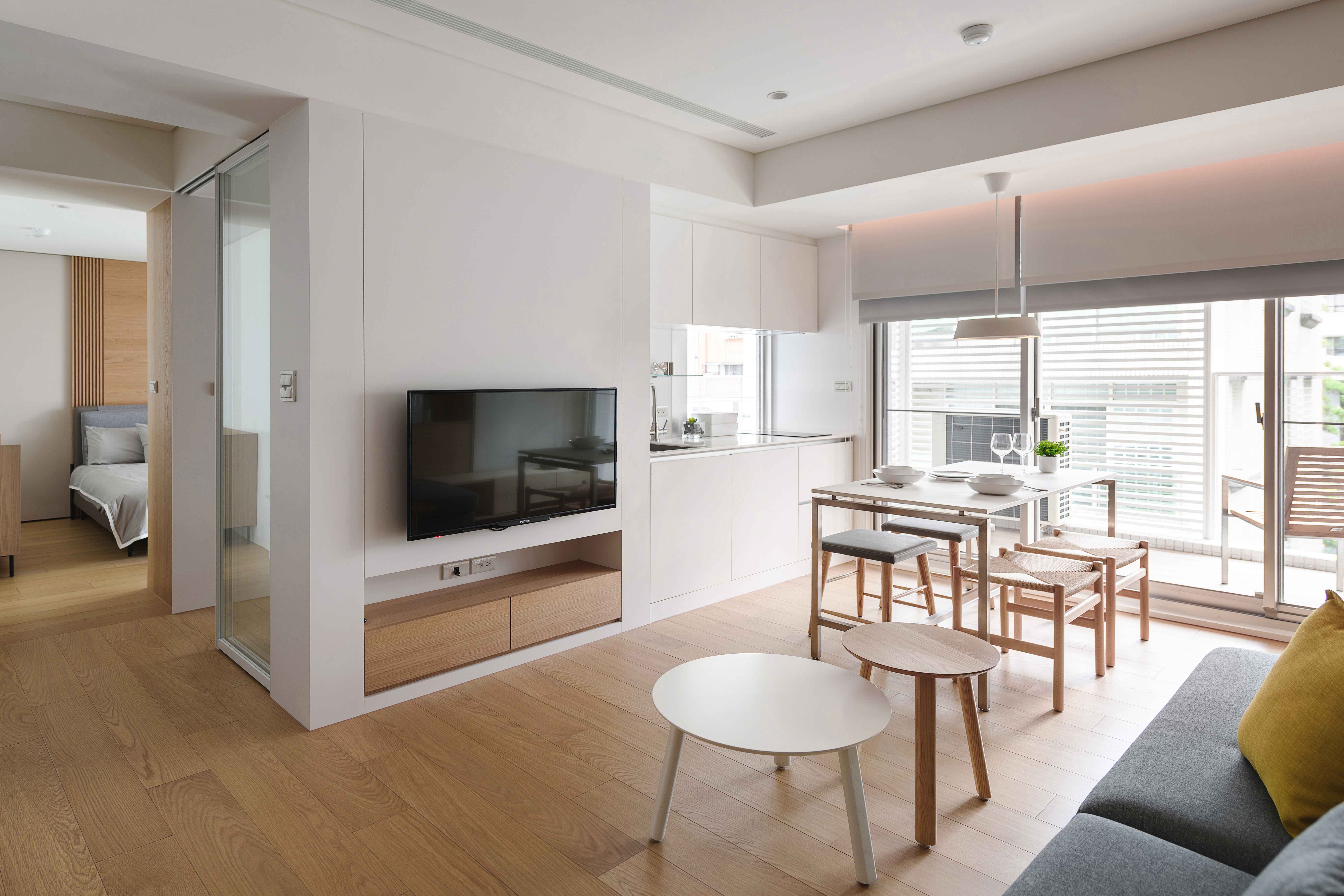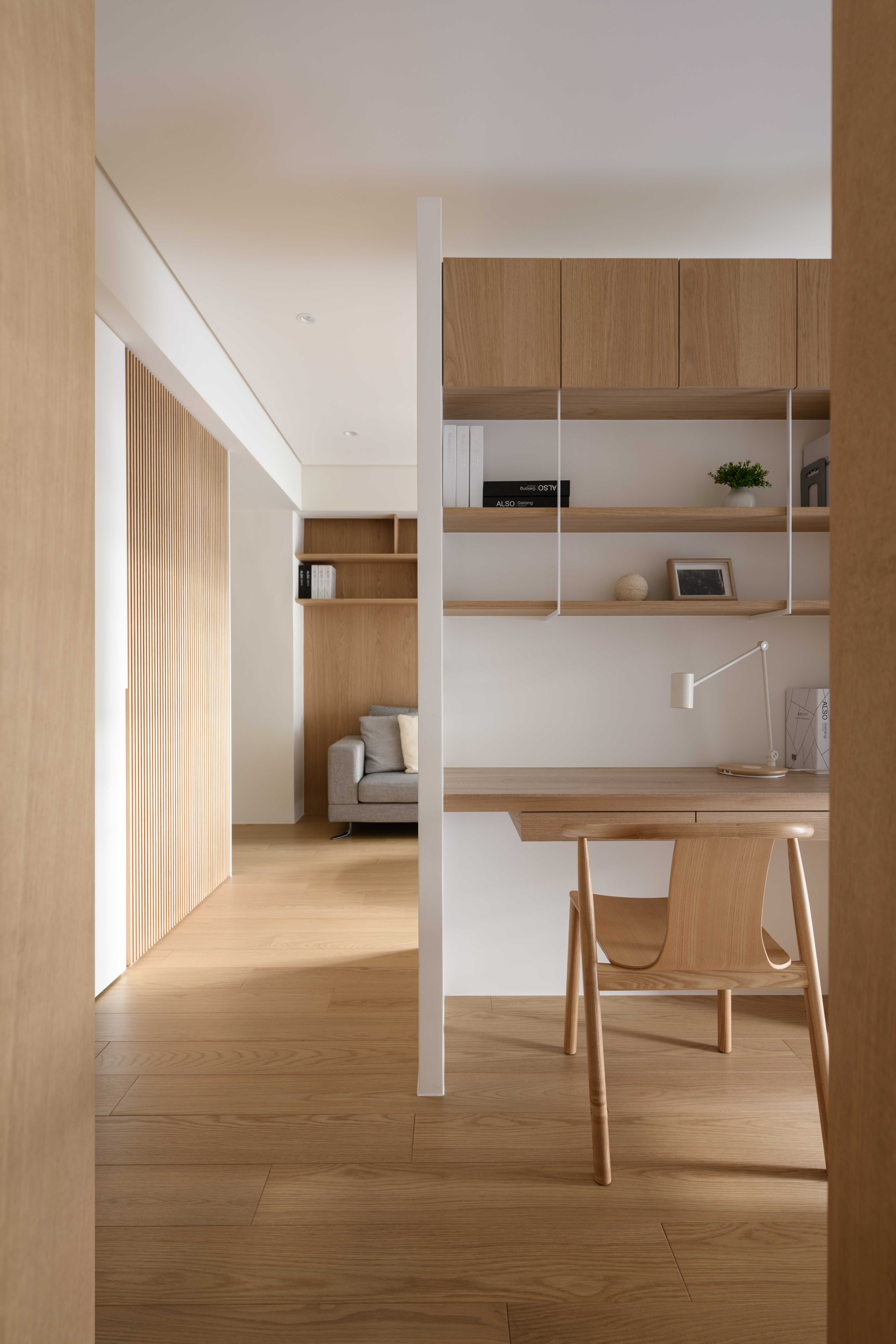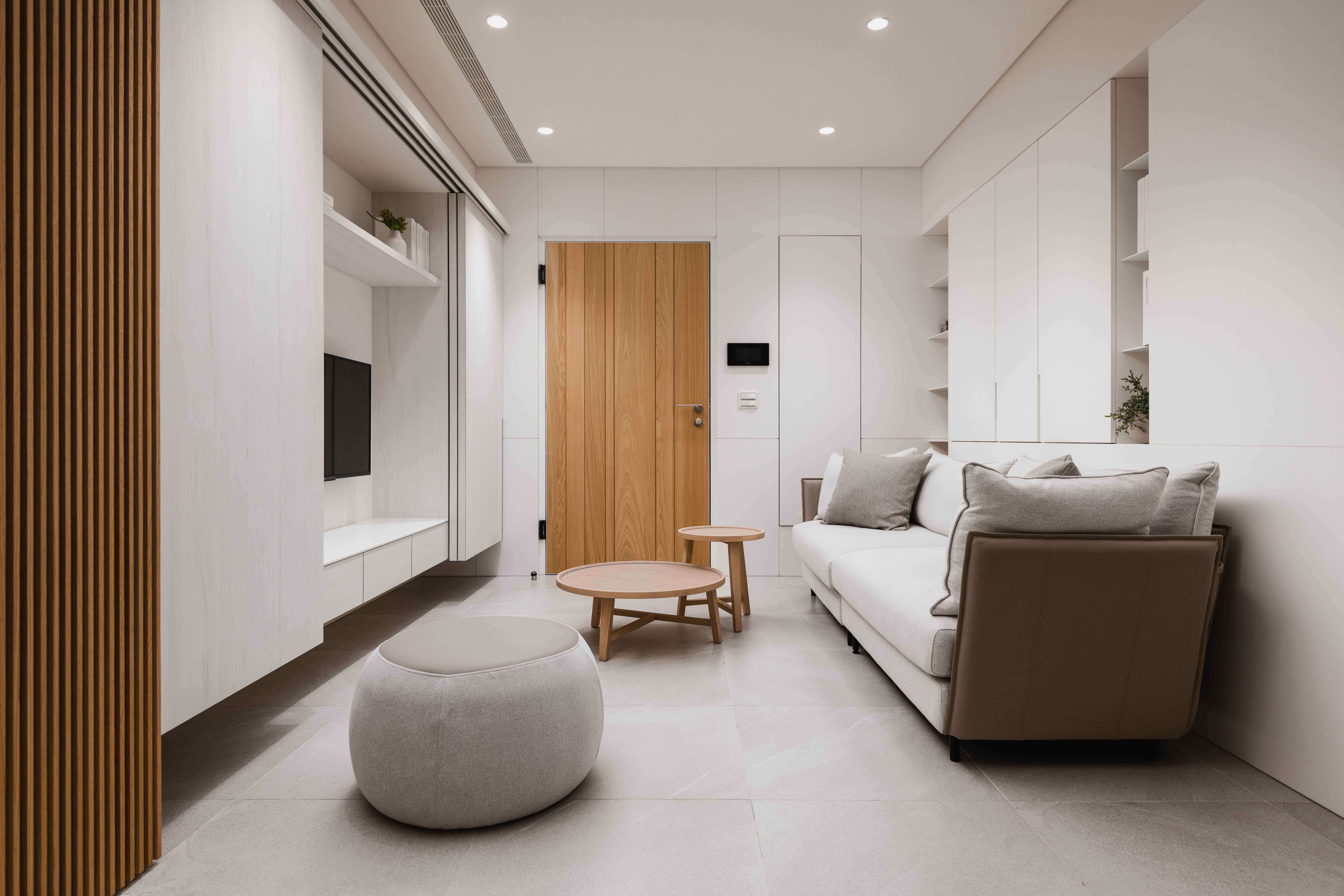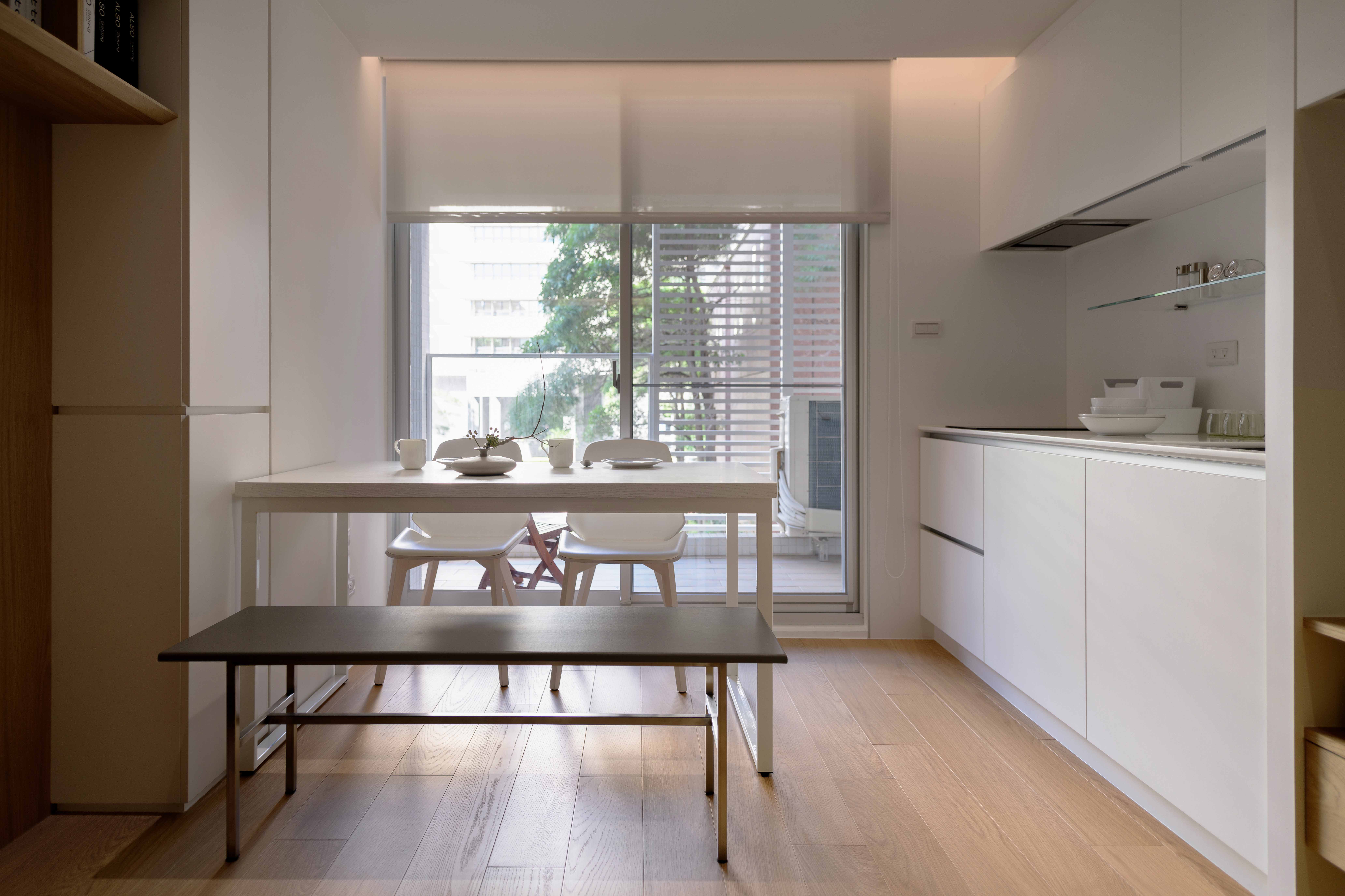 本基地為「T」形基地,前後臨路,將六併平面安排出五戶「邊間」,使住戶單元擁有良好的物理性能,如通風wind、採光light、視野view等..。在平面規劃之初,即將建築與室內同時並進,當你走入屋內,小而精巧的室內空間,沒有封閉的牆角,無需界定空間範圍vs「借景」、「穿透」的空間佈局在每個環節產生了「視覺延伸」的設計效果。建構每個單元融合成一個系統Merging systems into a stapled,「切割空間屬性」而不封閉空間界線,例如;links of LDKS(客廳living、餐廳dining、廚房kitchen、書房study)串連。「切割立面」,但不劃分屬性,例如;充滿機能性的牆嵌入牆面,房門呼應著牆面的延伸,達到視覺尺度放大的效果,如櫃子般的門(隱藏門)、純粹的白牆、溫潤的白橡地板、虛實俐落、超強收納、流暢的動線與內外交融的空間,讓室內延伸至戶外(陽台),不界定內外空間,突破小空間「狹窄」的刻板印象。