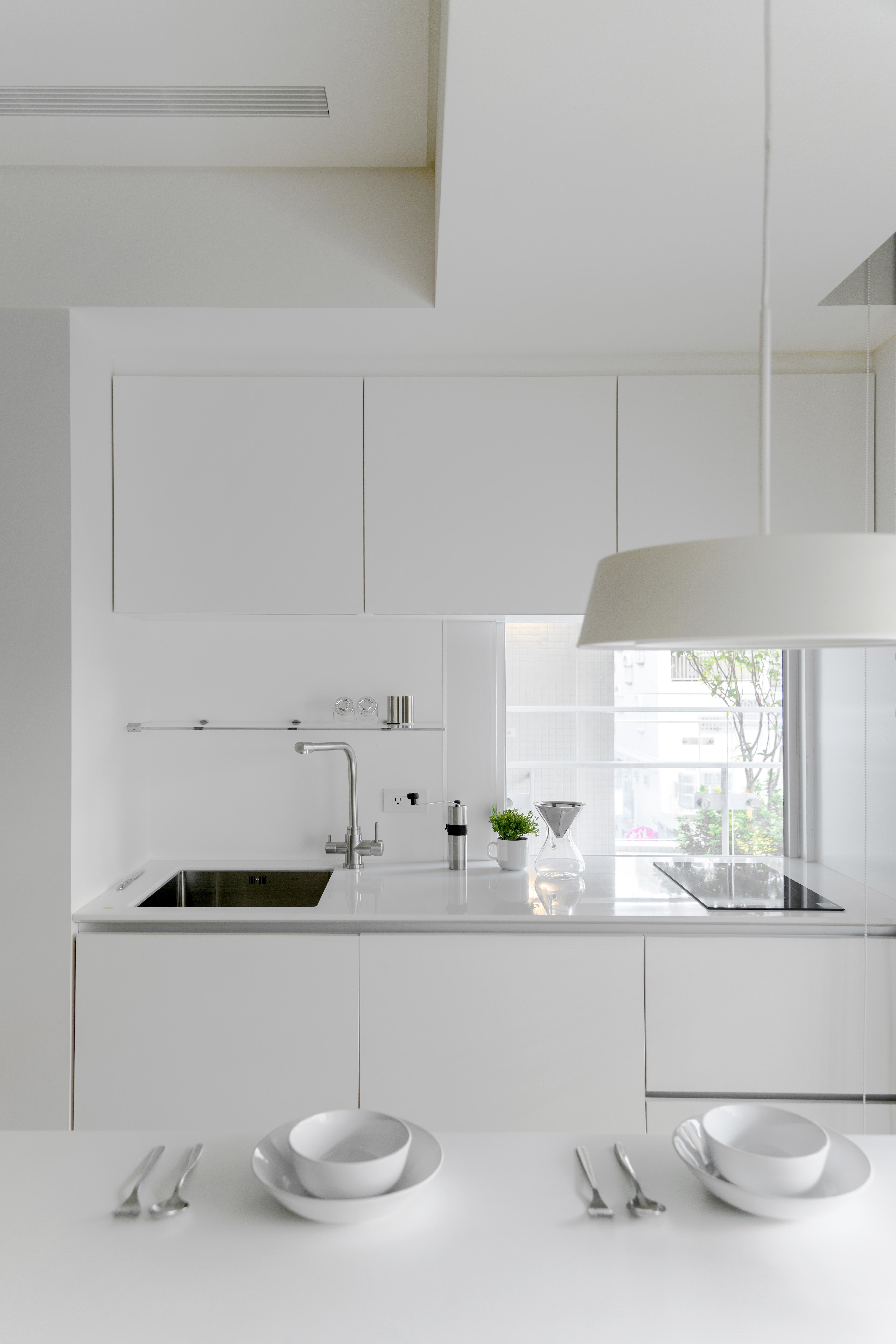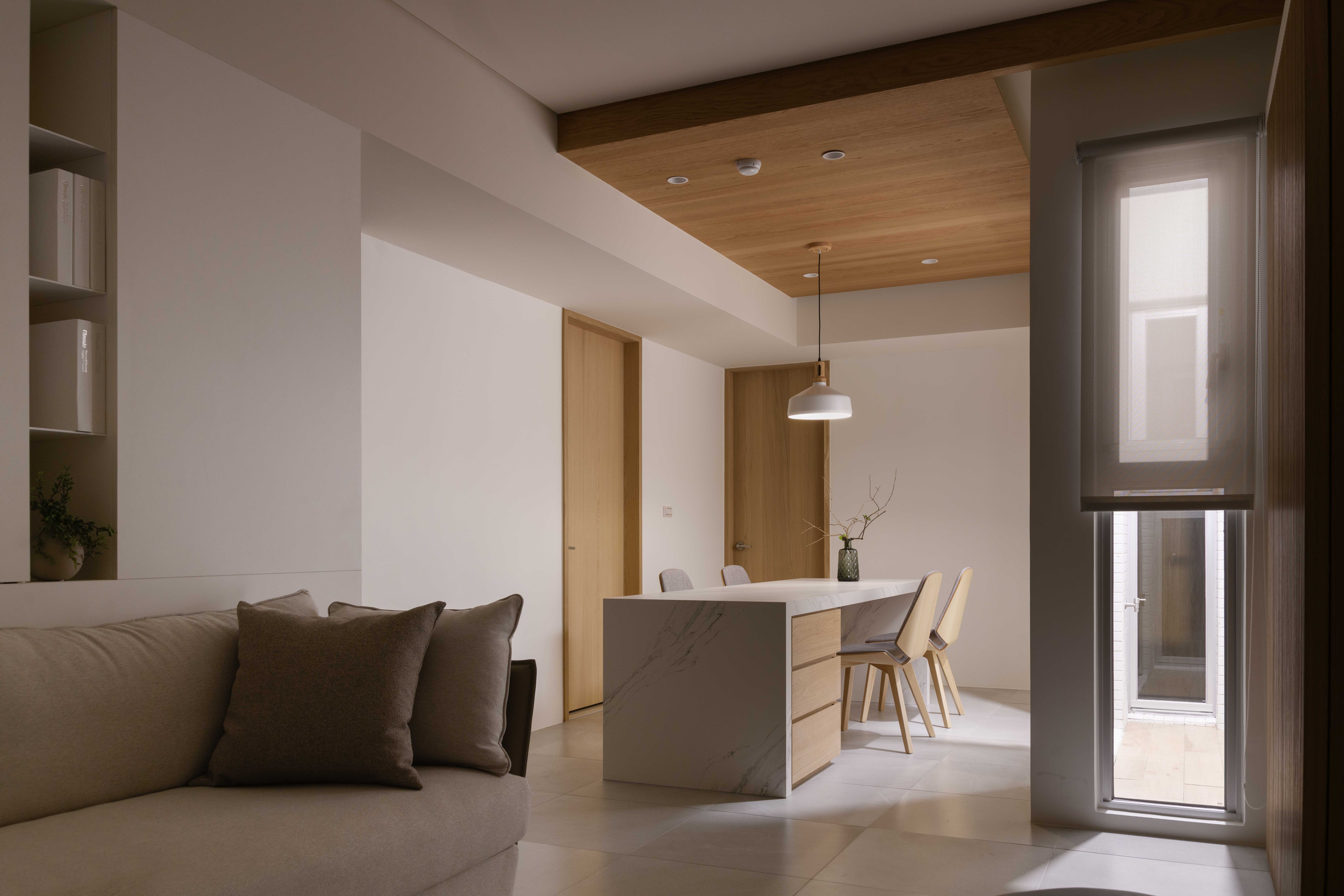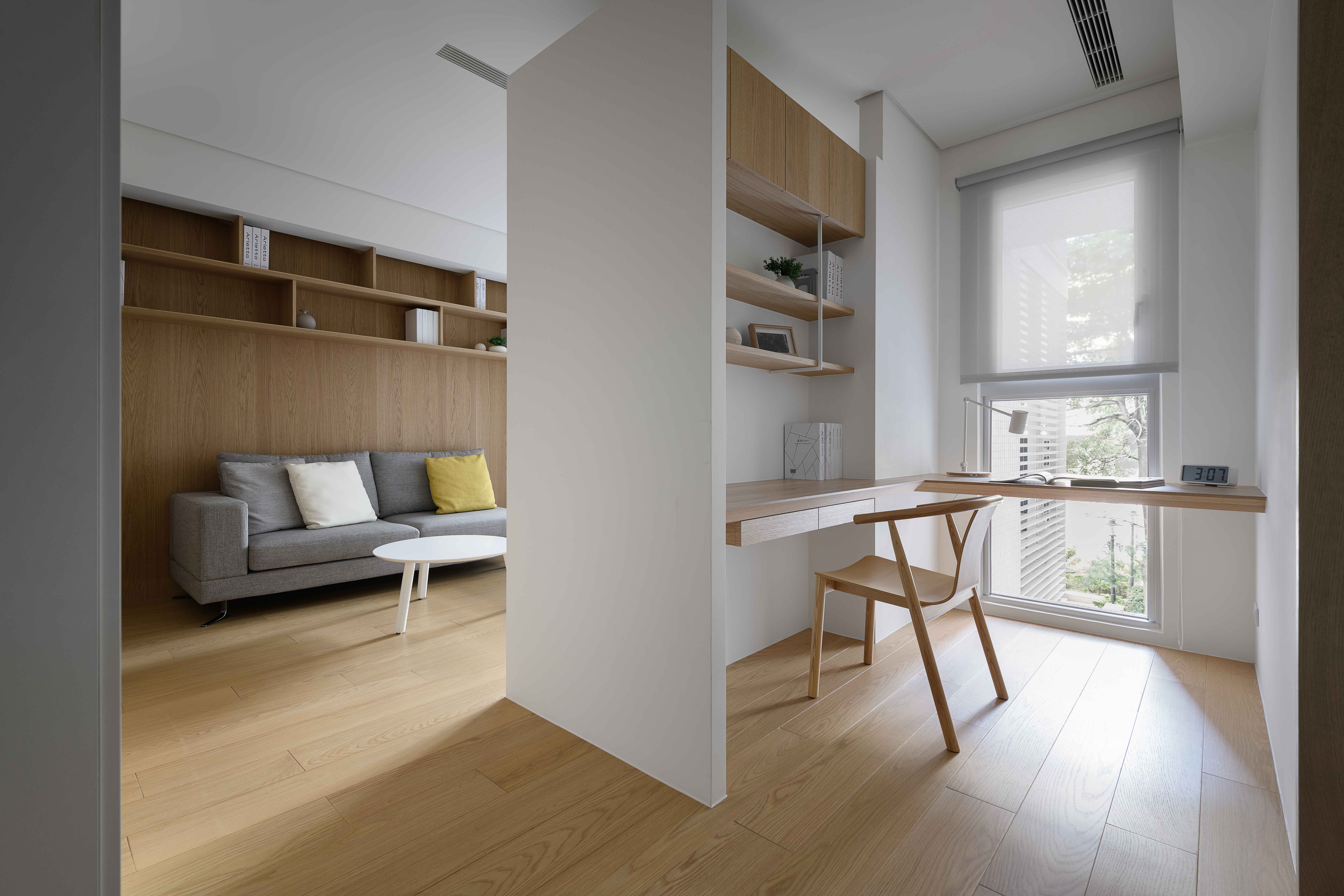 本基地為「T」形基地,前後臨路,將六併平面安排出五戶「邊間」,使住戶單元擁有良好的物理性能,如通風wind、採光light、視野view等..。在平面規劃之初,即將建築與室內同時並進,當你走入屋內,小而精巧的室內空間,沒有封閉的牆角,無需界定空間範圍vs「借景」、「穿透」的空間佈局在每個環節產生了「視覺延伸」的設計效果。建構每個單元融合成一個系統Merging systems into a stapled,「切割空間屬性」而不封閉空間界線,例如;links of LDKS(客廳living、餐廳dining、廚房kitchen、書房study)串連。「切割立面」,但不劃分屬性,例如;充滿機能性的牆嵌入牆面,房門呼應著牆面的延伸,達到視覺尺度放大的效果,如櫃子般的門(隱藏門)、純粹的白牆、溫潤的白橡地板、虛實俐落、超強收納、流暢的動線與內外交融的空間,讓室內延伸至戶外(陽台),不界定內外空間,突破小空間「狹窄」的刻板印象。