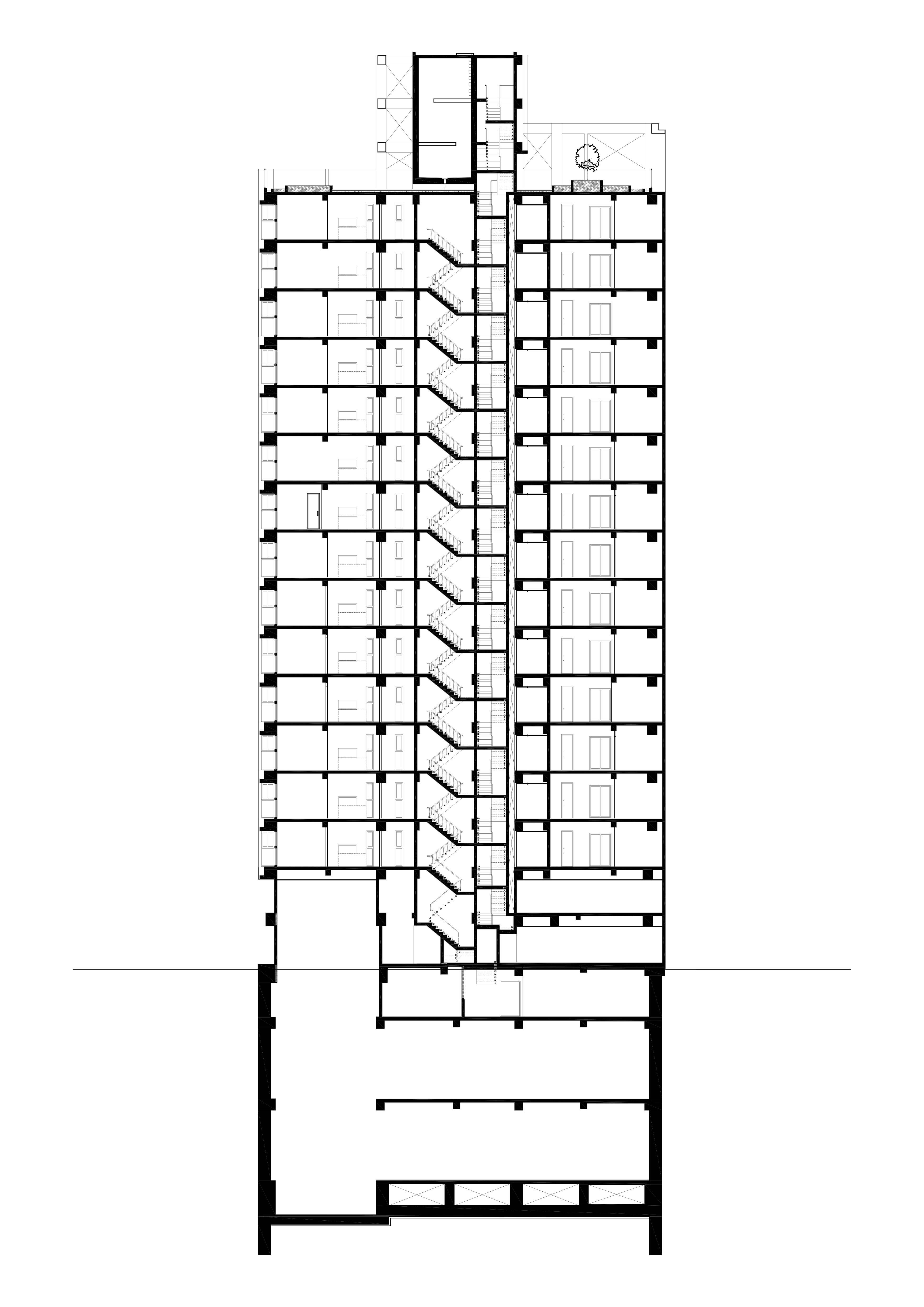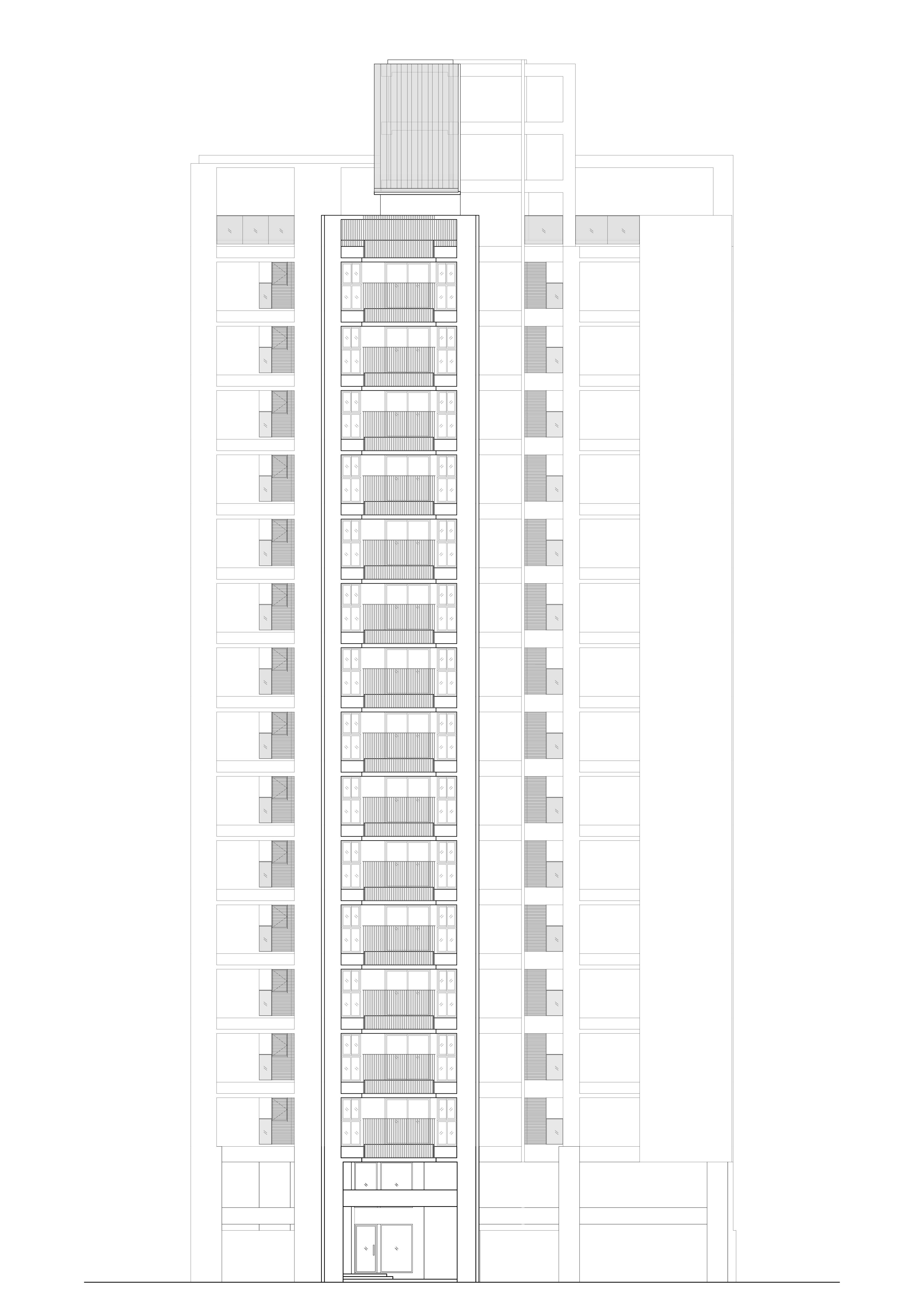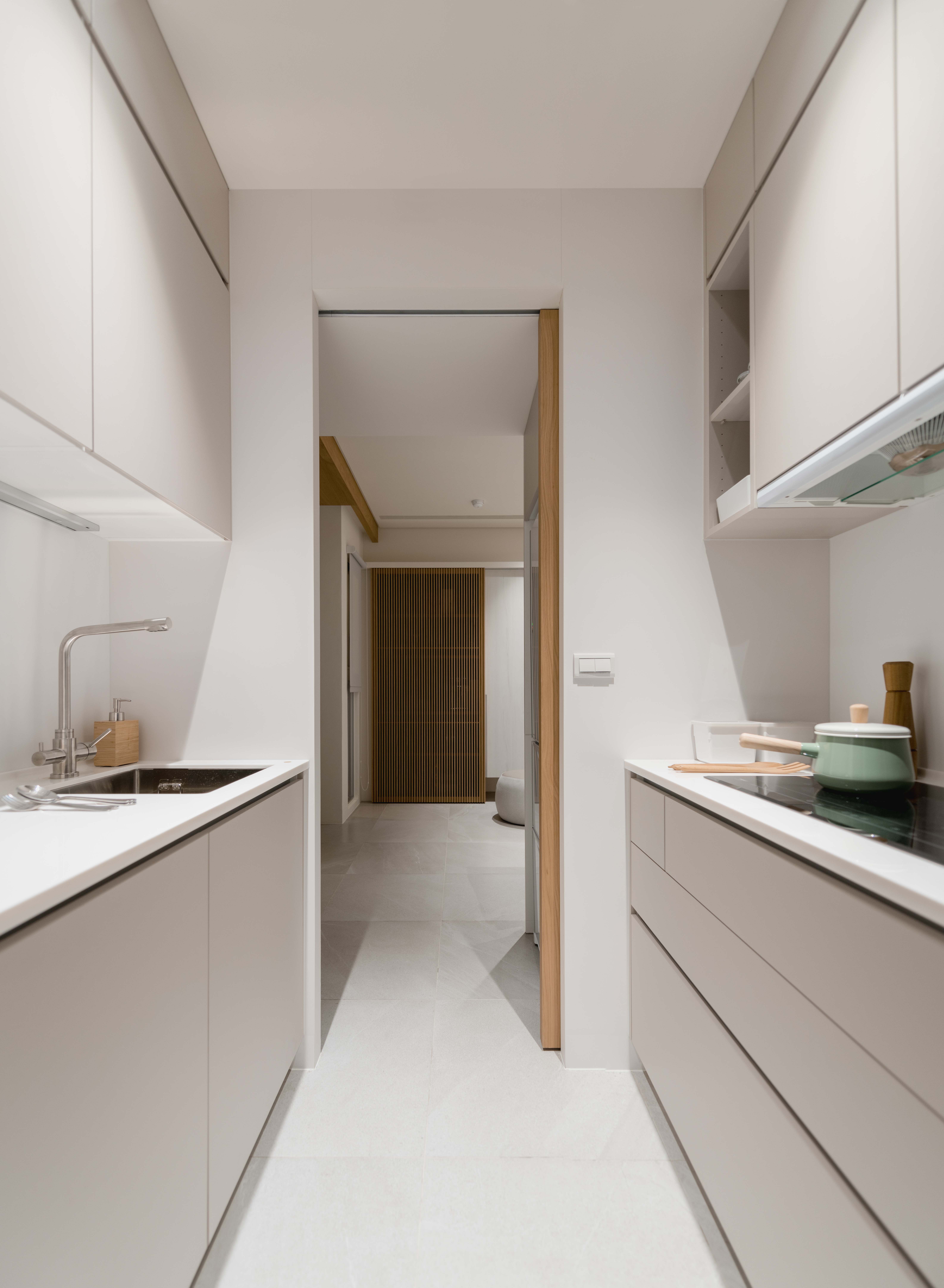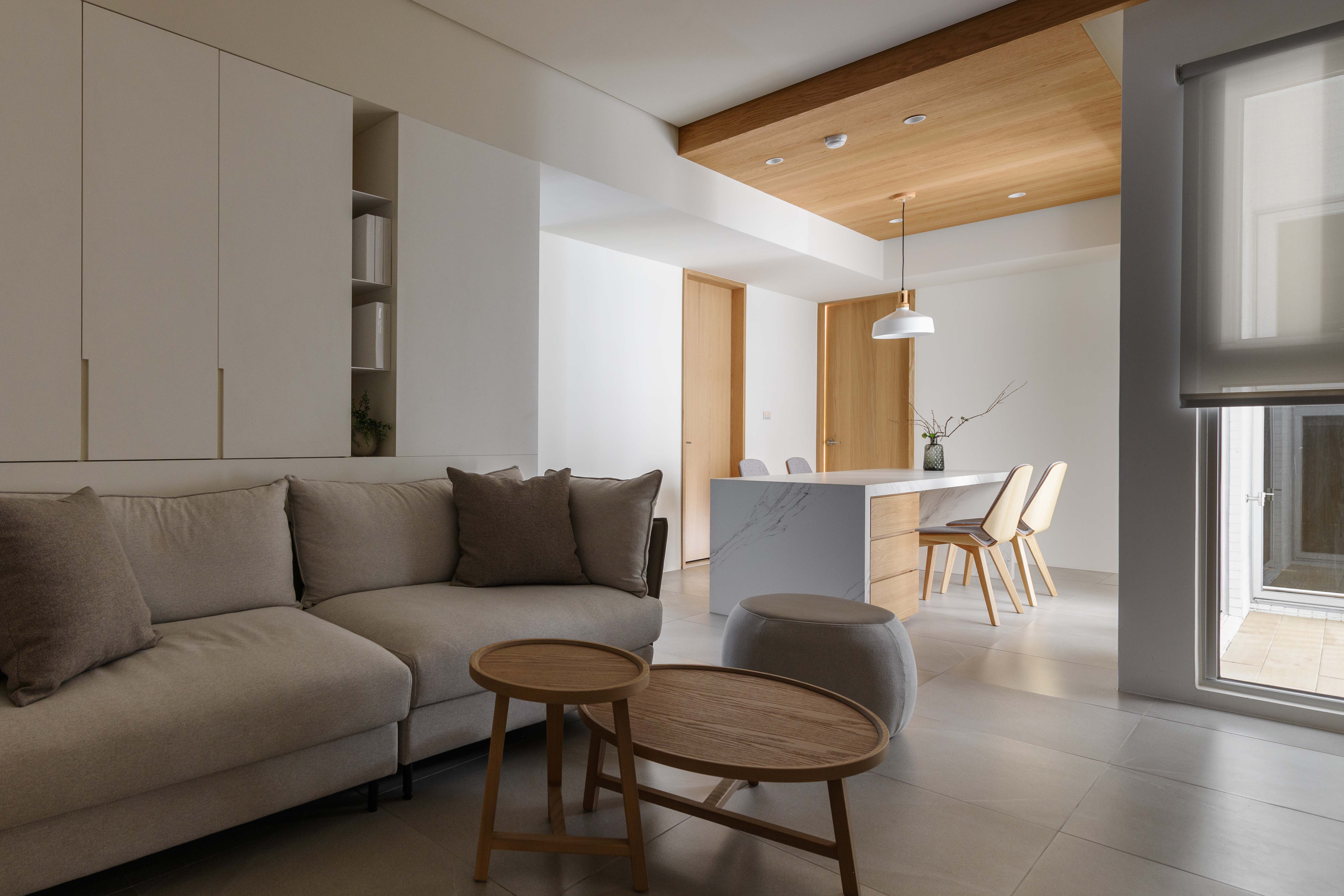 本基地為「T」形基地,前後臨路,將六併平面安排出五戶「邊間」,使住戶單元擁有良好的物理性能,如通風wind、採光light、視野view等..。在平面規劃之初,即將建築與室內同時並進,當你走入屋內,小而精巧的室內空間,沒有封閉的牆角,無需界定空間範圍vs「借景」、「穿透」的空間佈局在每個環節產生了「視覺延伸」的設計效果。建構每個單元融合成一個系統Merging systems into a stapled,「切割空間屬性」而不封閉空間界線,例如;links of LDKS(客廳living、餐廳dining、廚房kitchen、書房study)串連。「切割立面」,但不劃分屬性,例如;充滿機能性的牆嵌入牆面,房門呼應著牆面的延伸,達到視覺尺度放大的效果,如櫃子般的門(隱藏門)、純粹的白牆、溫潤的白橡地板、虛實俐落、超強收納、流暢的動線與內外交融的空間,讓室內延伸至戶外(陽台),不界定內外空間,突破小空間「狹窄」的刻板印象。