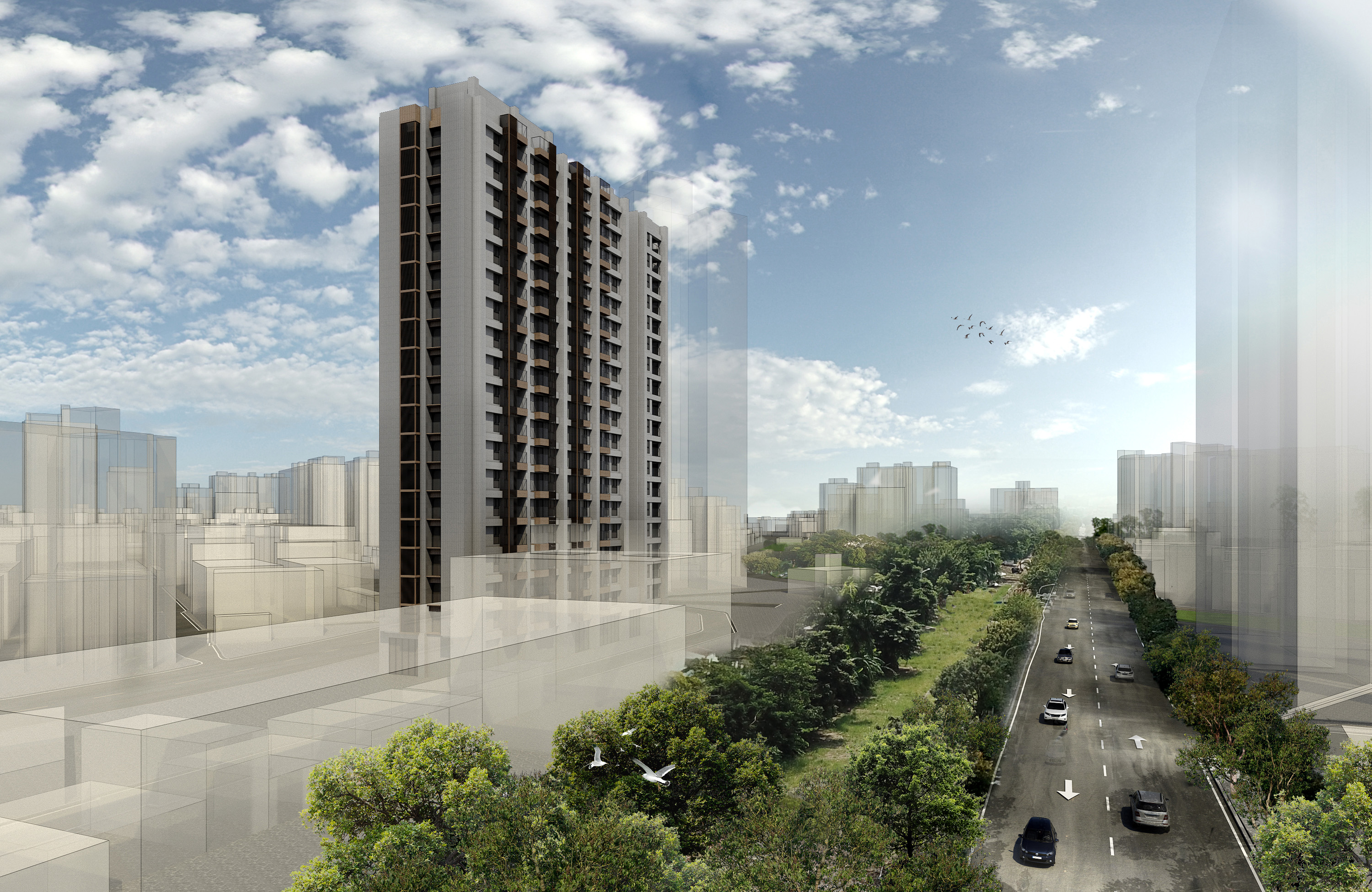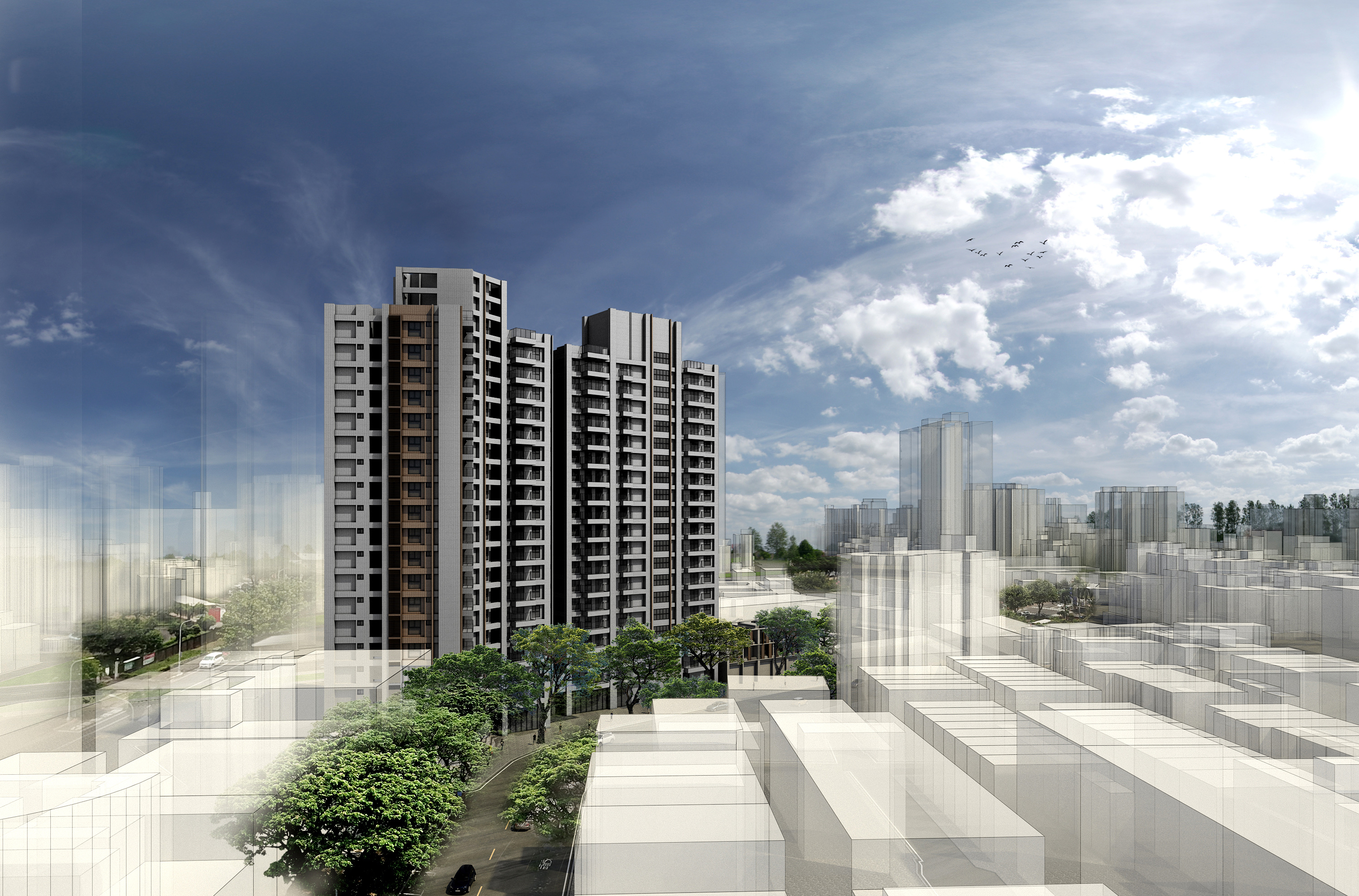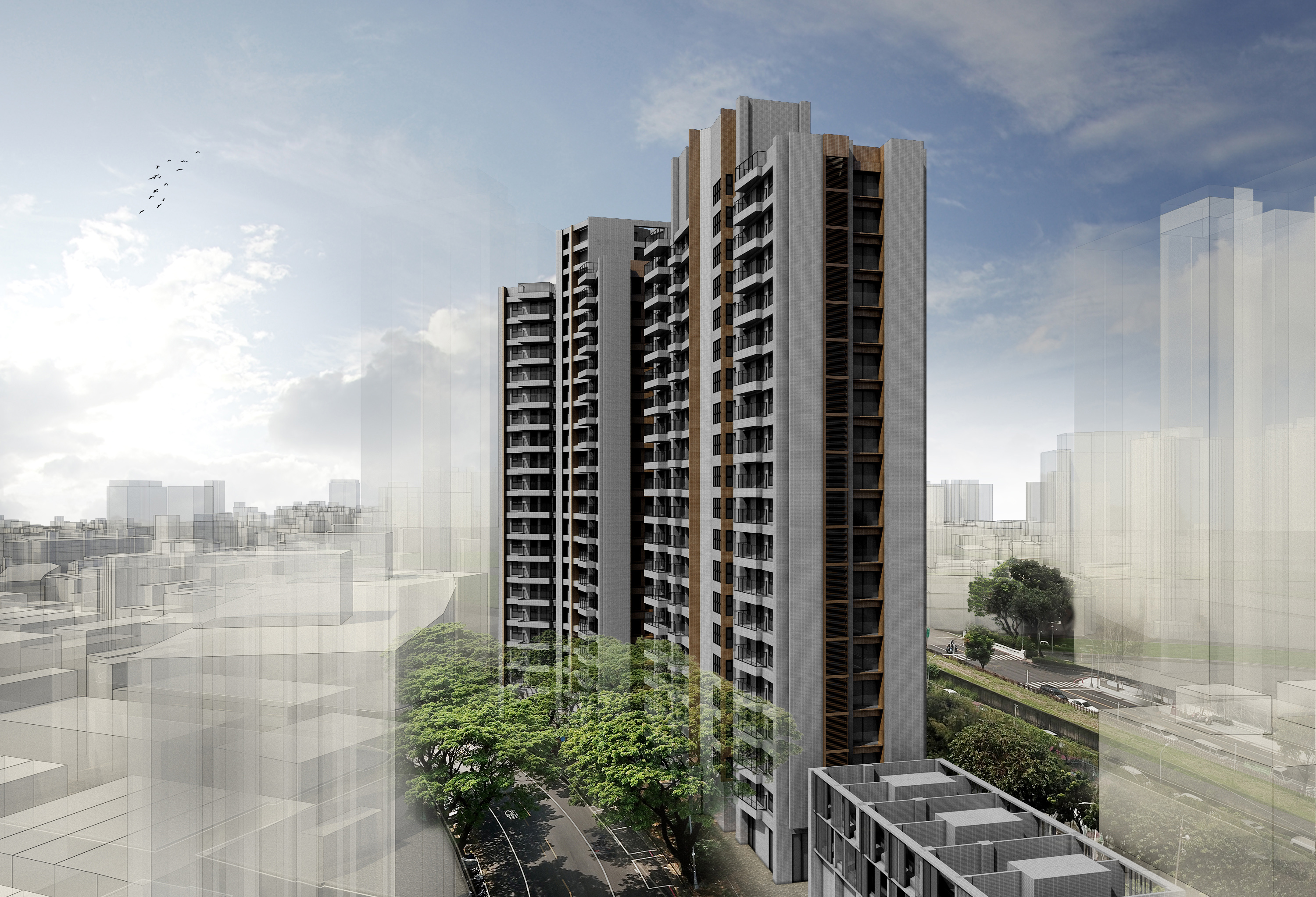 鳳 凰 頌業主:隆大營建基地座落:臺灣 / 高雄市 / 苓雅區設計時間:2019 / 06基地面積:3424m² (約1035.76坪)總樓地板:28584.56m² (約8646.83坪)建築規模:地上19層 / 地下3層建築構造 : RC(Reinforced Concerte)鋼筋混凝土構造